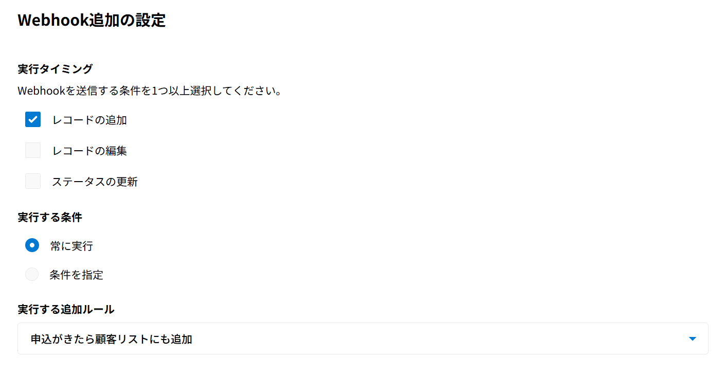 kintoneのWebhookの機能を利用して、レコードの追加/レコードの編集/ステータスの更新 をきっかけに、自動でレコード追加を実行できます。