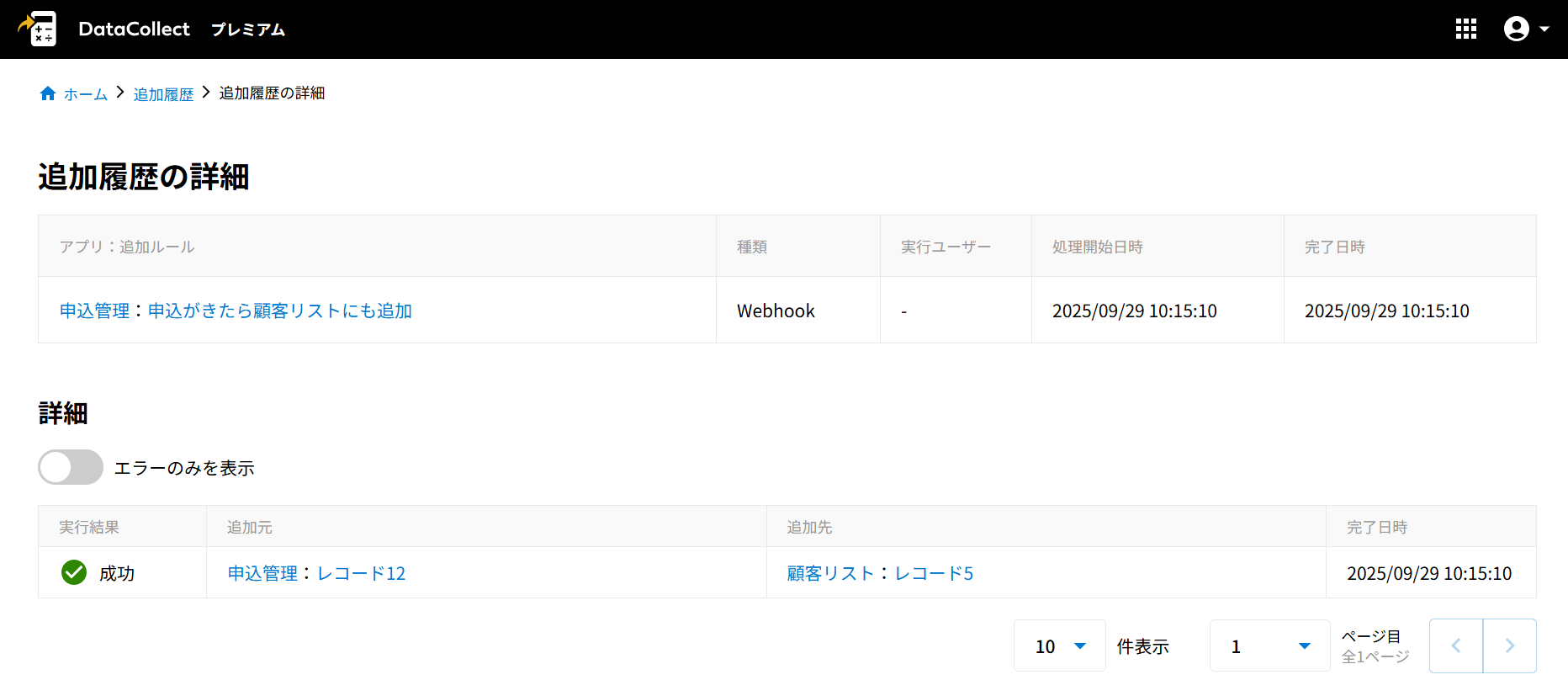 「追加履歴」画面から確認可能です。「Webhook履歴」画面には表示されません。