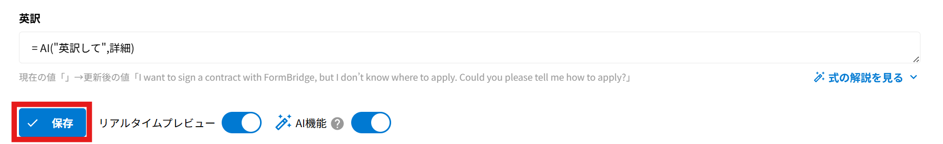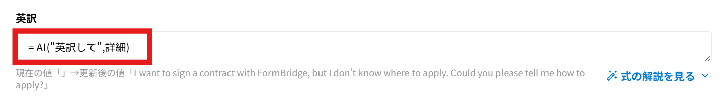 フィールド名等の情報からAIがフィールド式を提案し、提案したフィールド式の意味を解説します。
