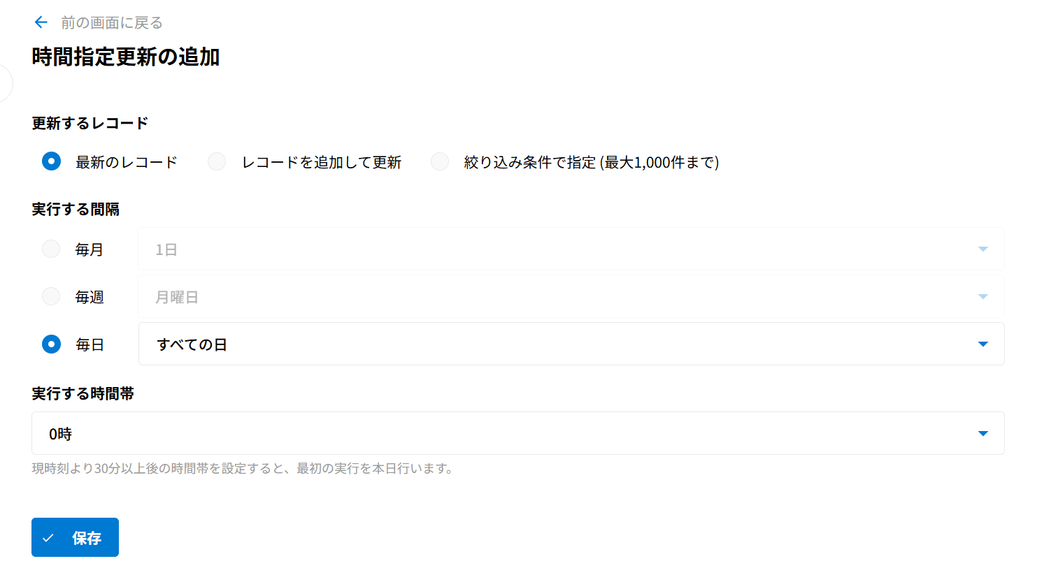 9.時間を指定した自動実行を行いたい場合は、時間指定更新の設定をすることができます。