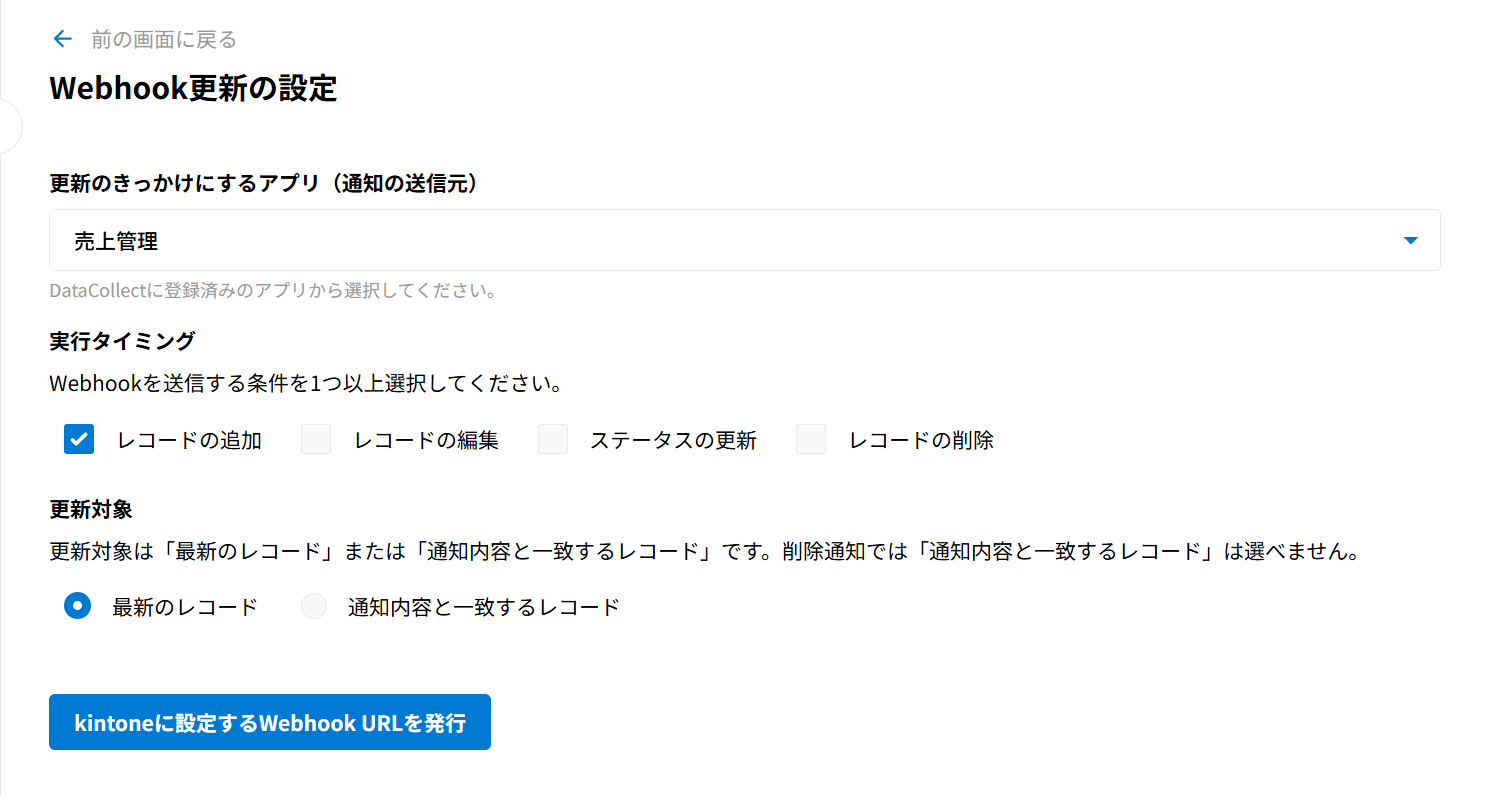 10.Webhook更新(リアルタイム更新)の設定では、kintoneアプリへの「レコードの追加/レコードの編集/レコードの削除/ステータスの更新」をきっかけに、設定に応じた指定のレコードを自動で更新することができます。