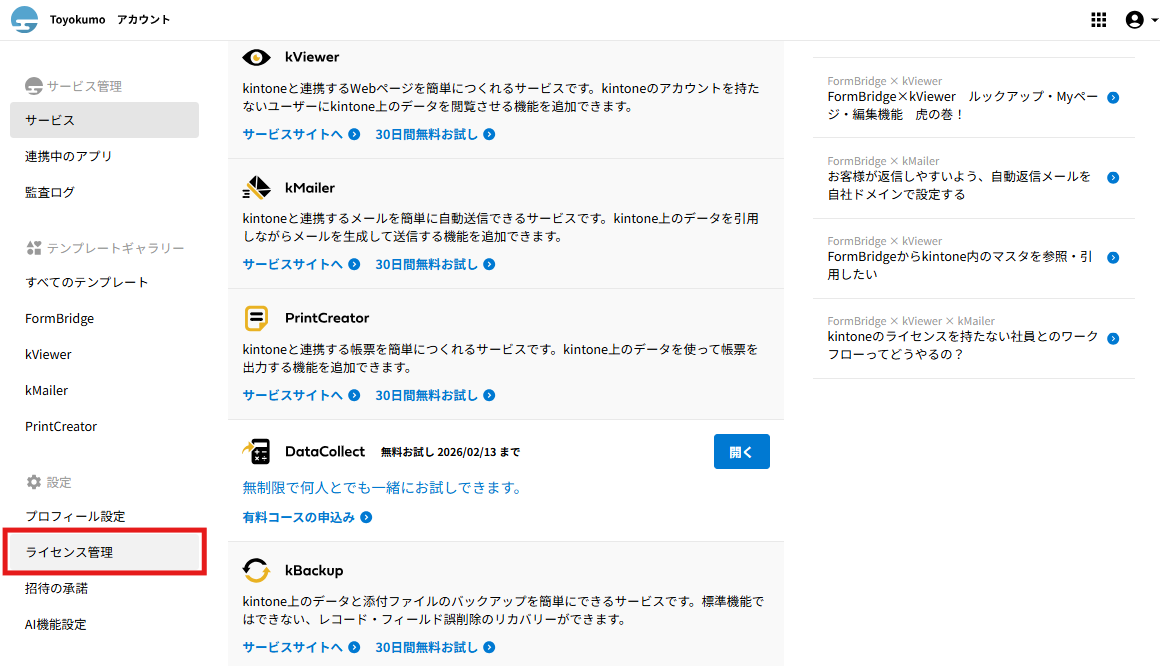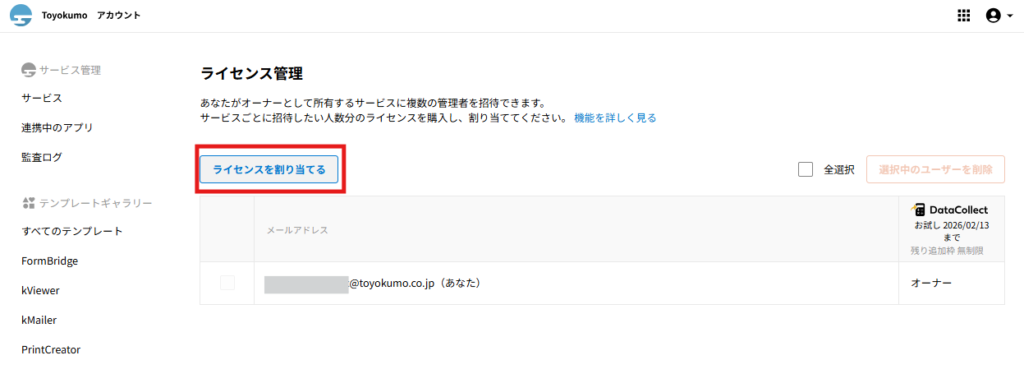 詳細は同一環境のトヨクモのkintone連携サービスにライセンスを追加して複数名で利用できますか?をご確認ください。