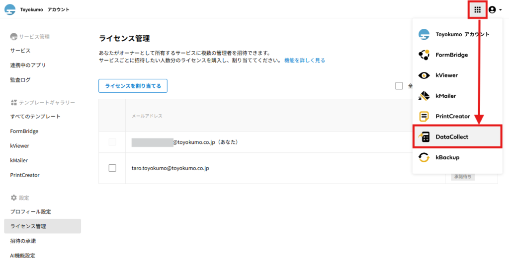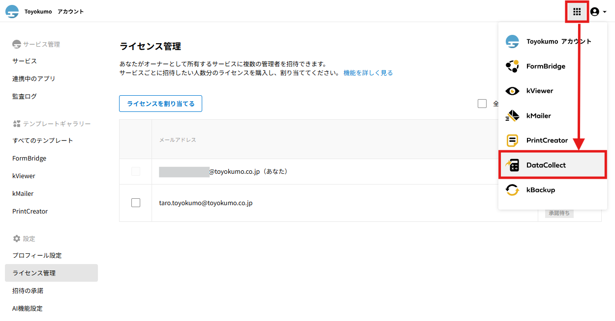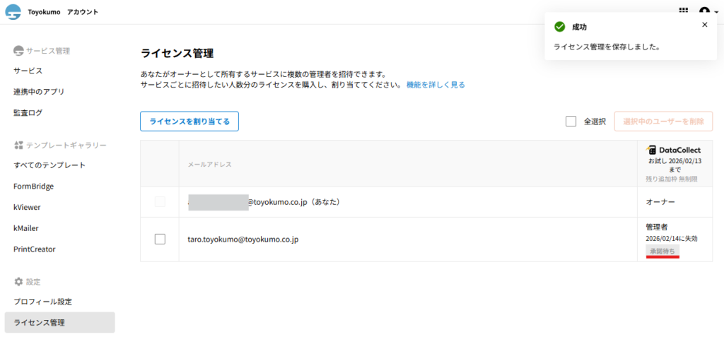招待された側のユーザーの操作に関してはトヨクモkintone連携サービスの詳細を受け取った際の操作方法をご確認ください。