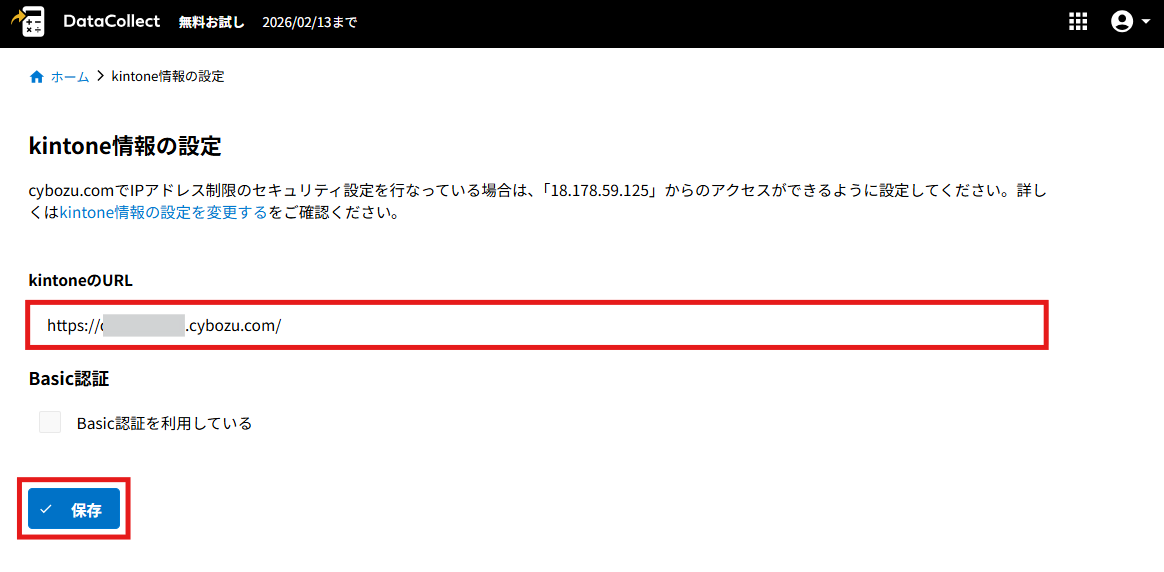接続するkintoneのURLを登録し、[保存]をクリックします。