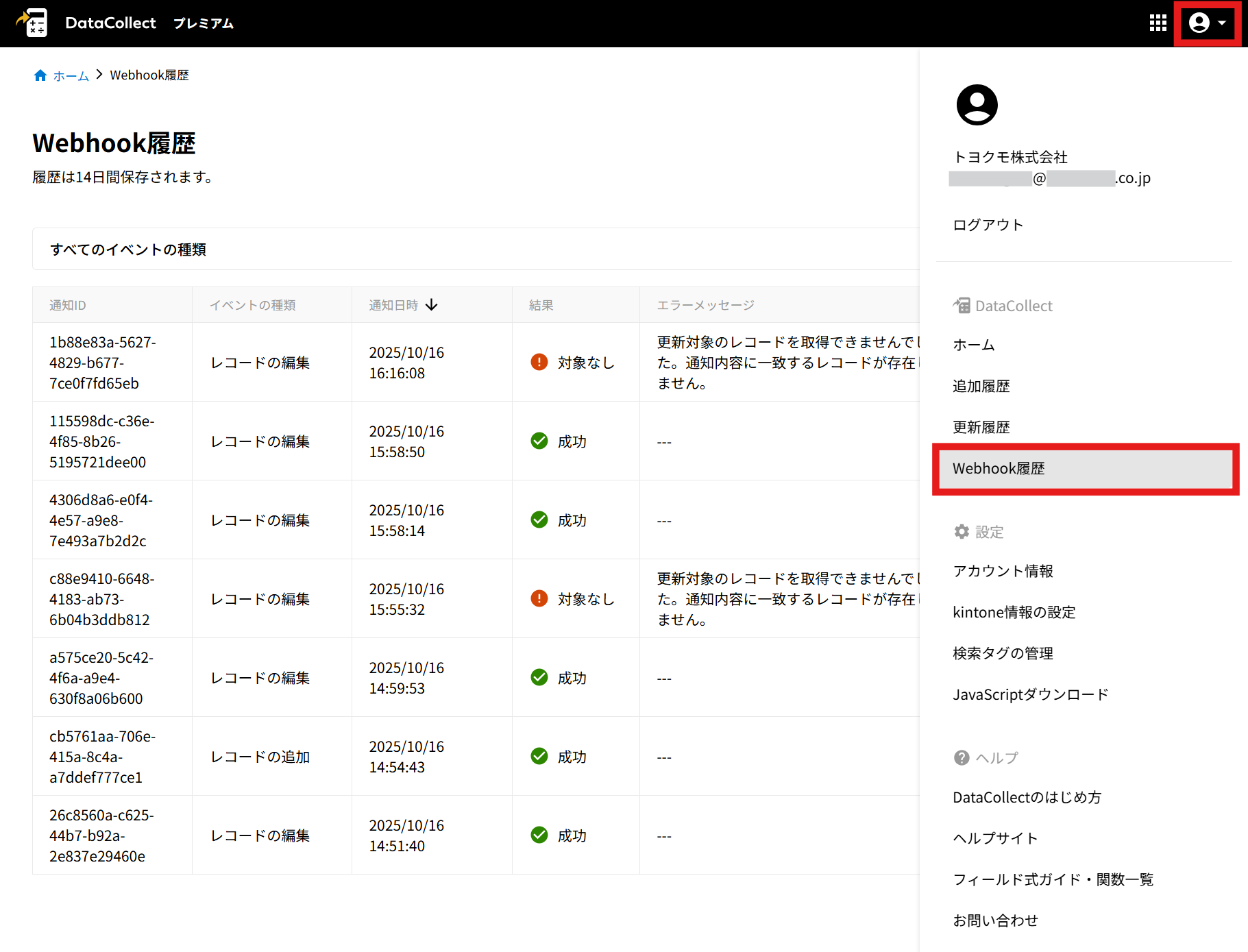画面右上のアイコン>「Webhook履歴」をクリックすることで確認が可能です。