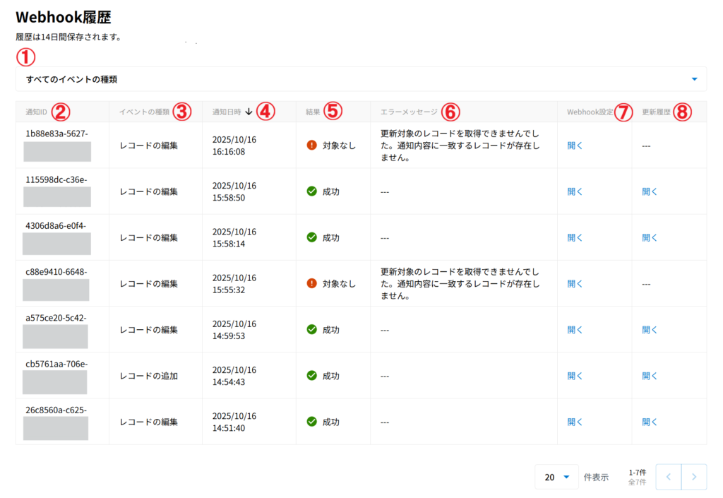 ①表示するイベントの種類 | 選択したイベントのWebhook履歴を表示します。 |