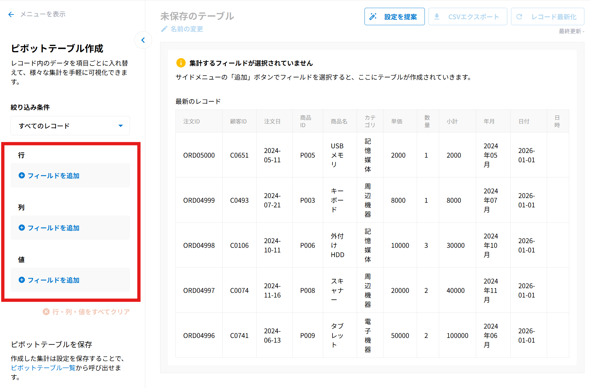 - 行・列を2フィールド追加した場合、ドラッグアンドドロップで順番を入れ替えることが可能です。