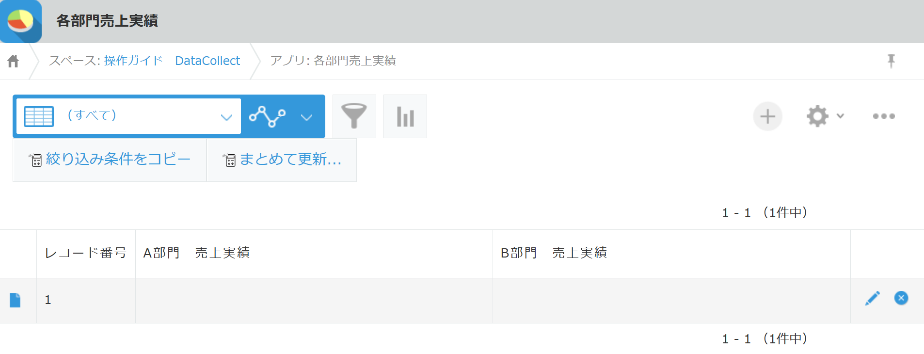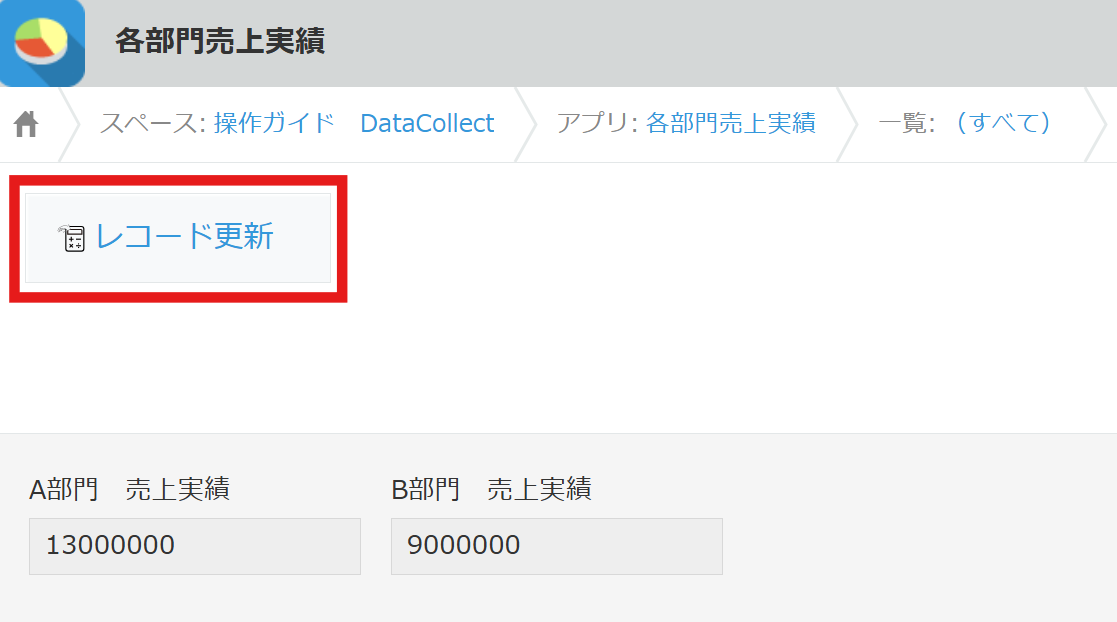 売上実績アプリに登録された各部門の売上の合計を、各部門売上実績アプリに集計します。