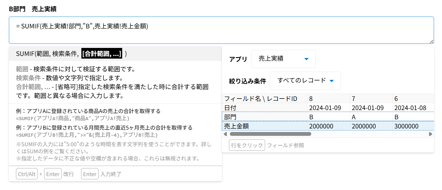 = SUMIF(売上実績!部門,"B",売上実績!売上金額)
