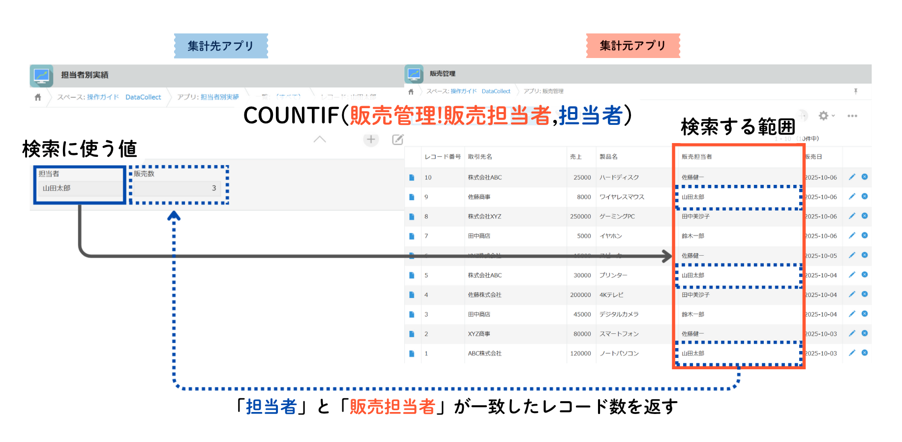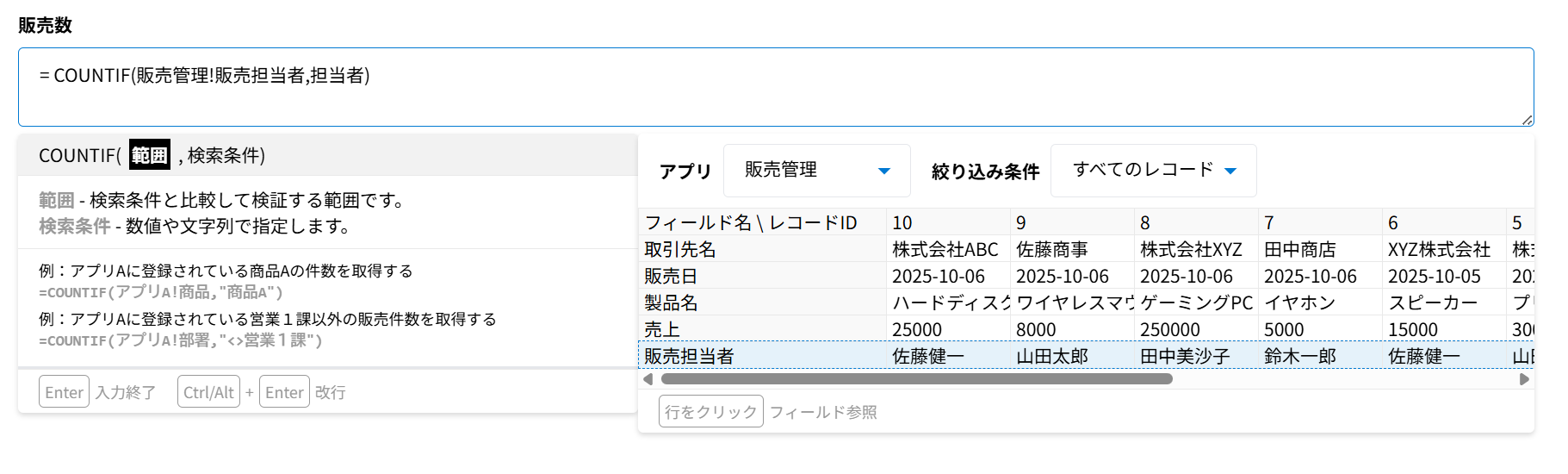 3.今回はCOUNTIFを利用し、販売管理アプリ(集計元アプリ)のレコードをカウントします。