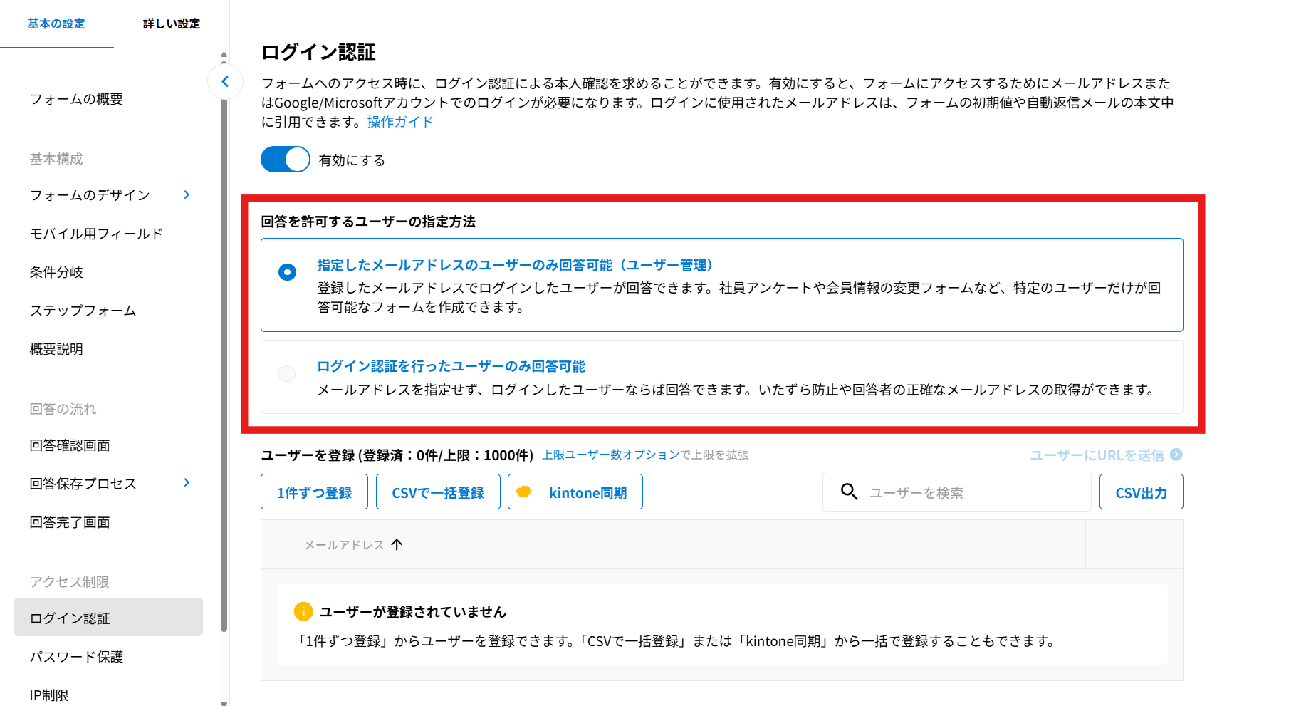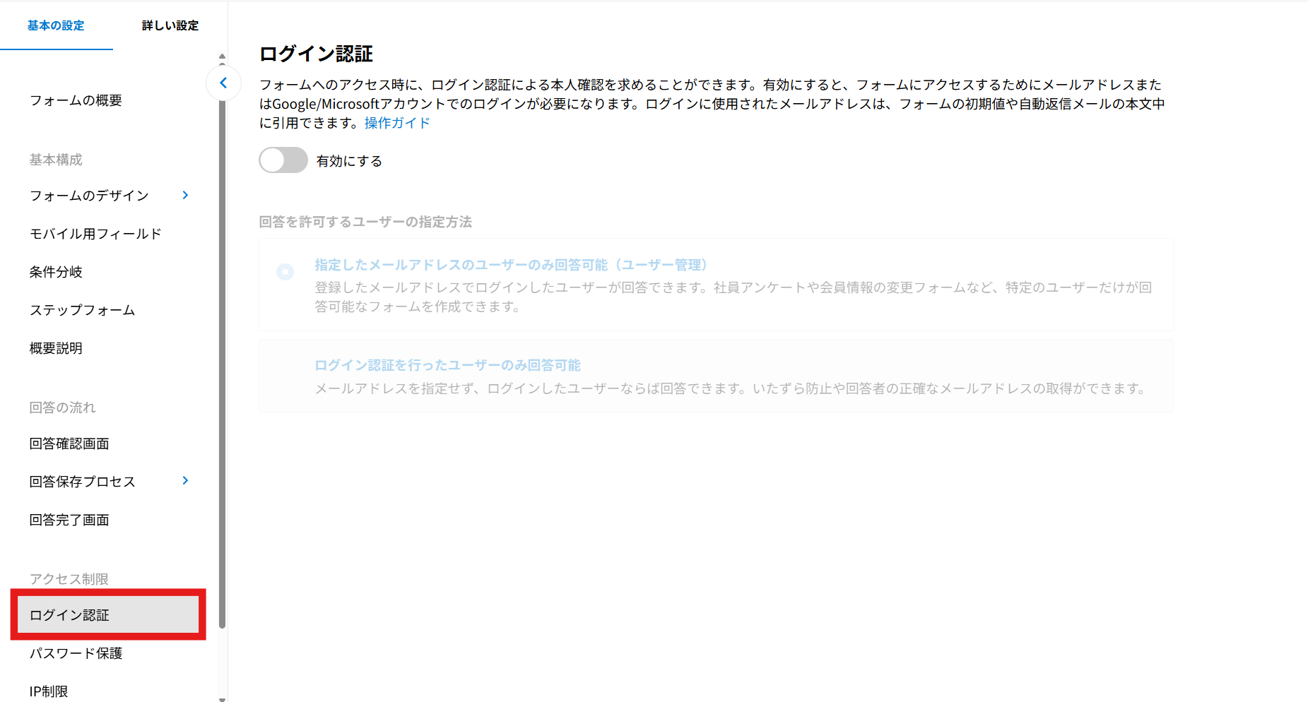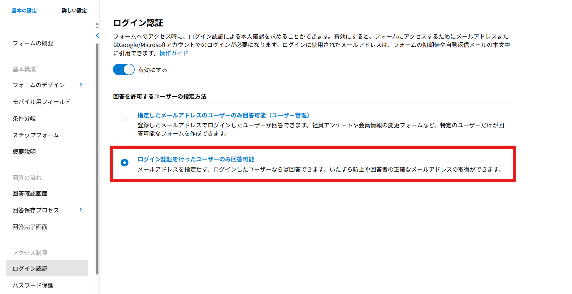 1.「ログイン認証を行ったユーザーのみ回答可能」を選択します。