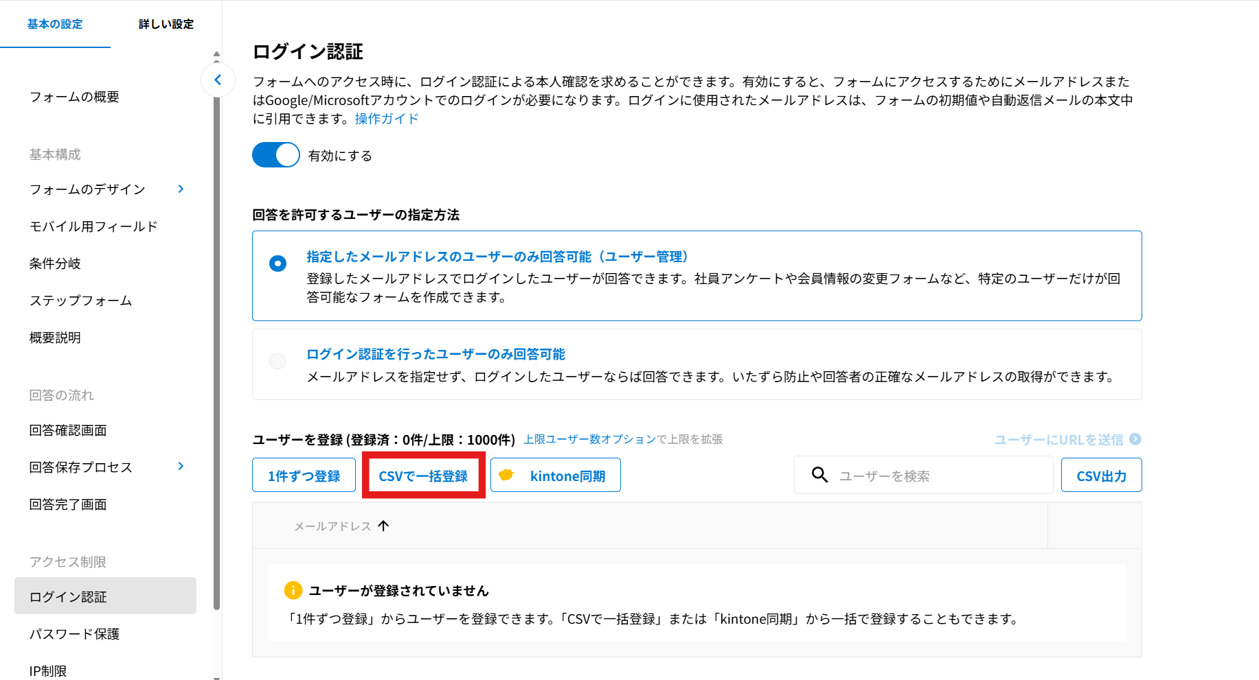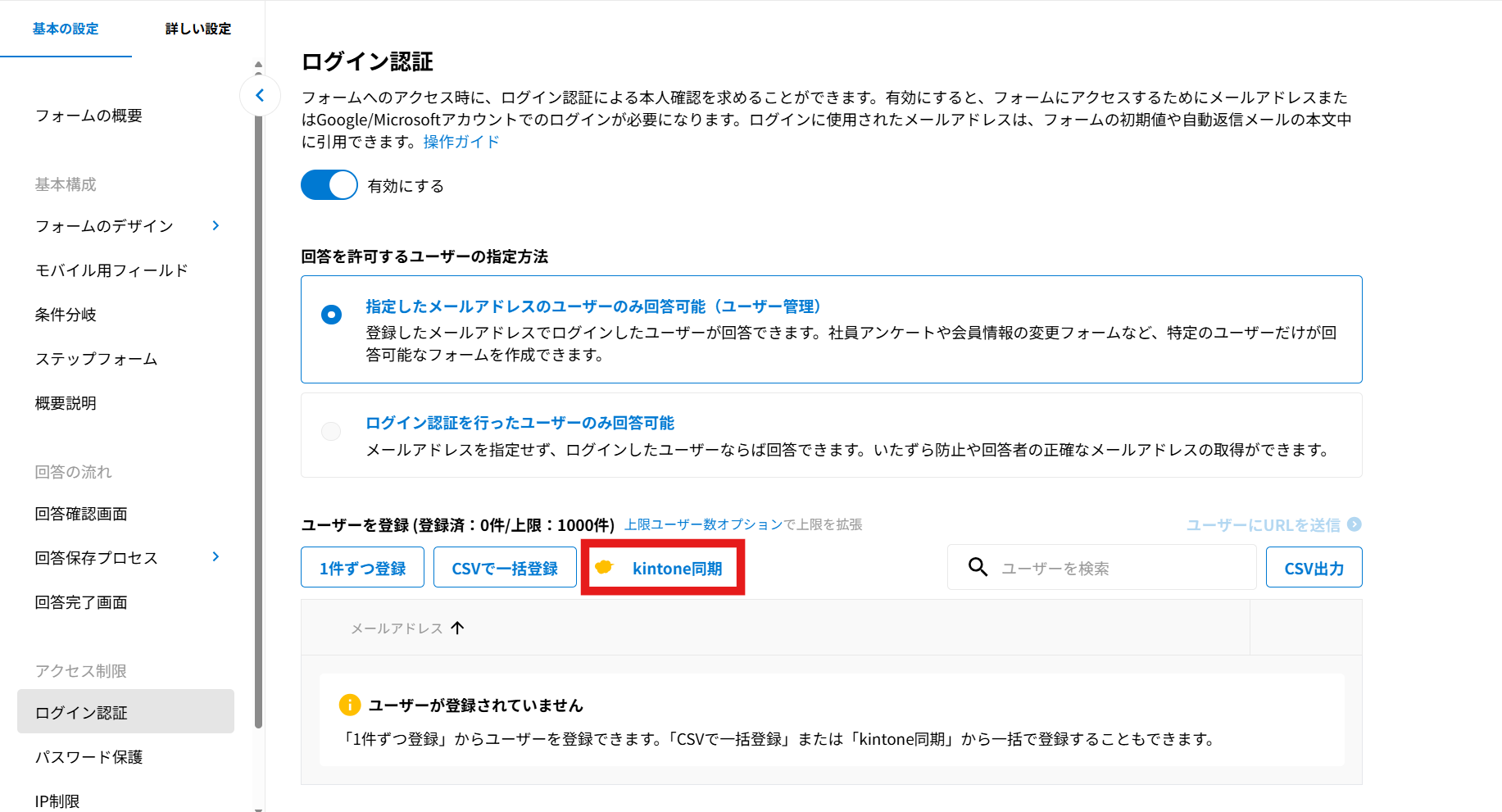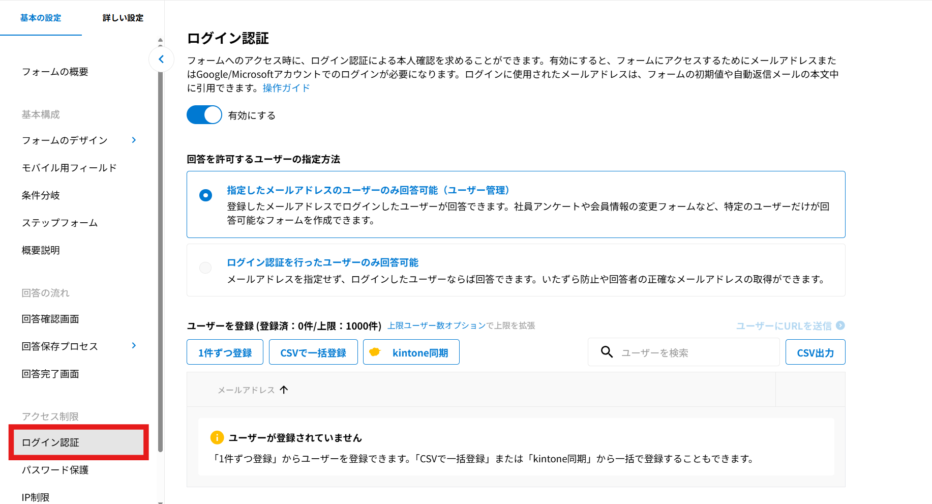 1.「ログイン認証を行ったユーザーのみ回答可能」を選択します。