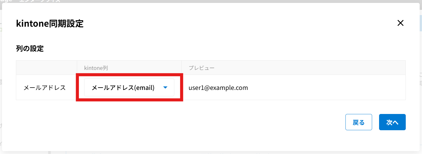 10.列の設定で、ログイン認証に利用したいメールアドレスが入っているフィールドを、kintone列として選択し、[次へ]をクリックします。