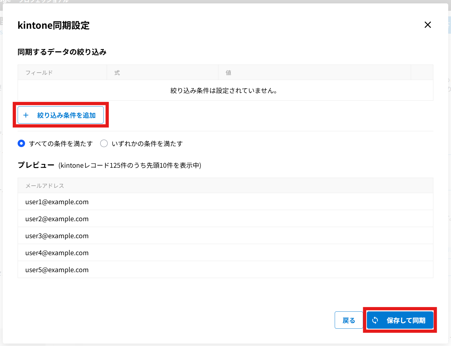同期するデータの絞り込みを行いたい場合は、[絞り込み条件を追加]から絞り込み条件を設定の上、[保存して同期]をクリックします。