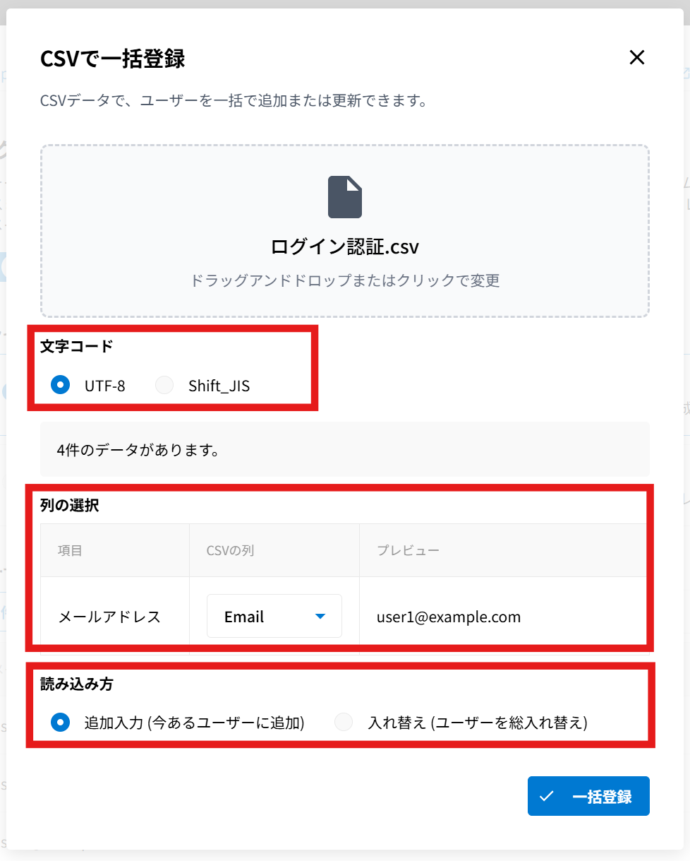 CSVファイルは「UTF-8」で読み込まれるため、文字化けしている場合は「文字コード」を「Shift-JIS」に変更してください。