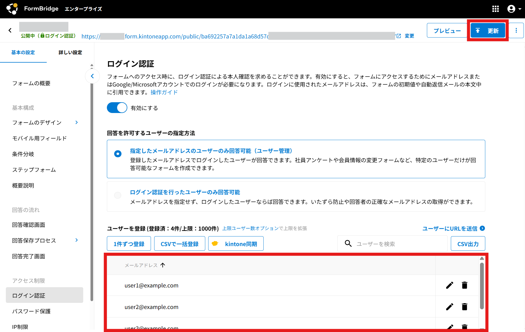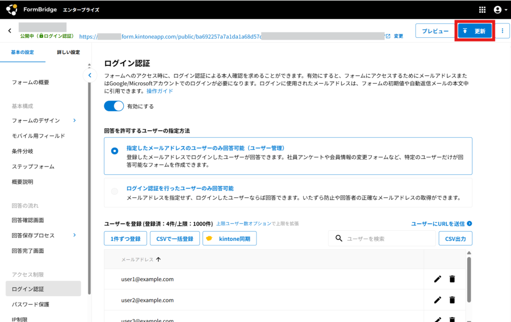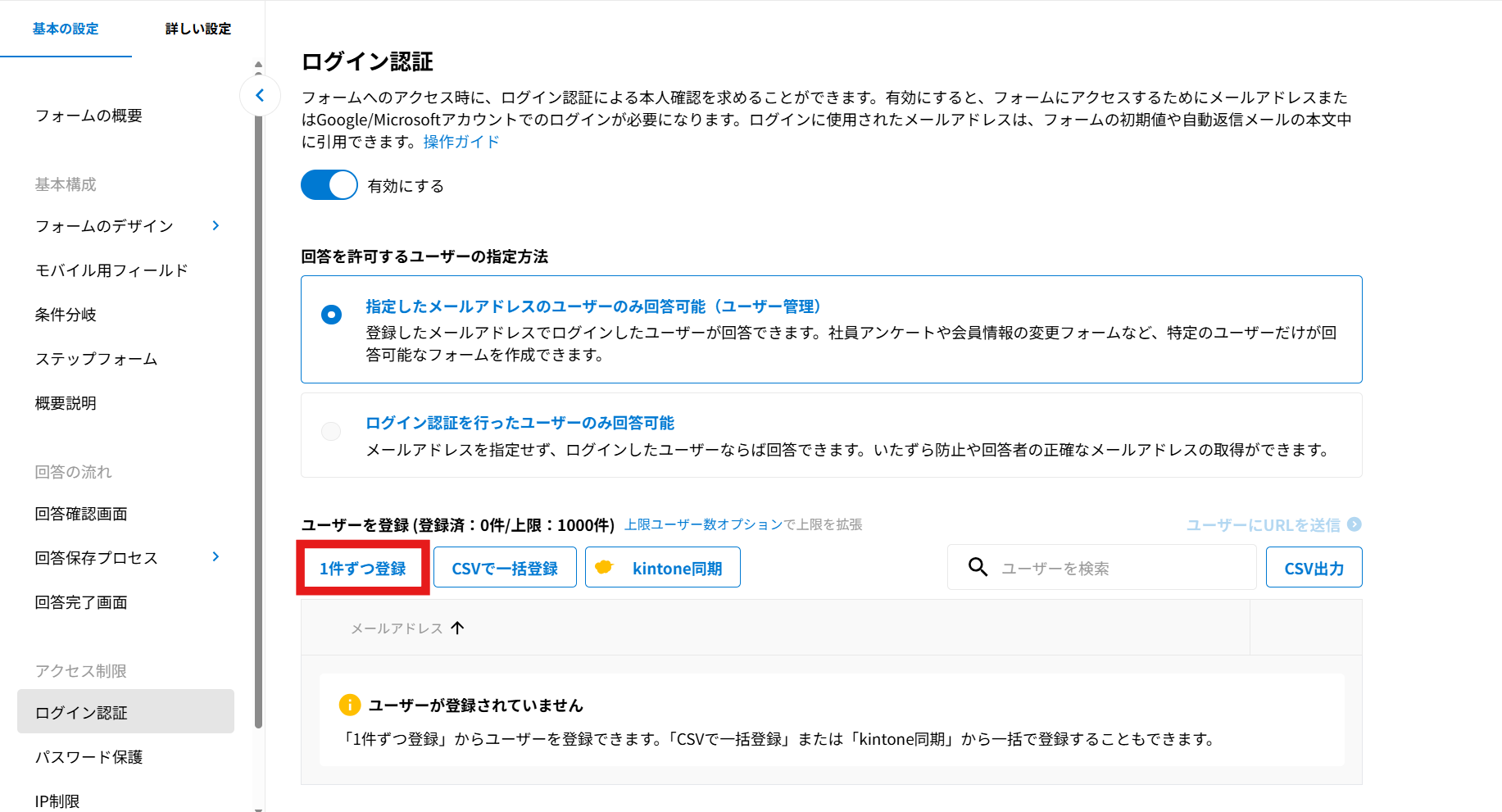 指定したメールアドレスのユーザーのみ回答可能(ユーザー管理)