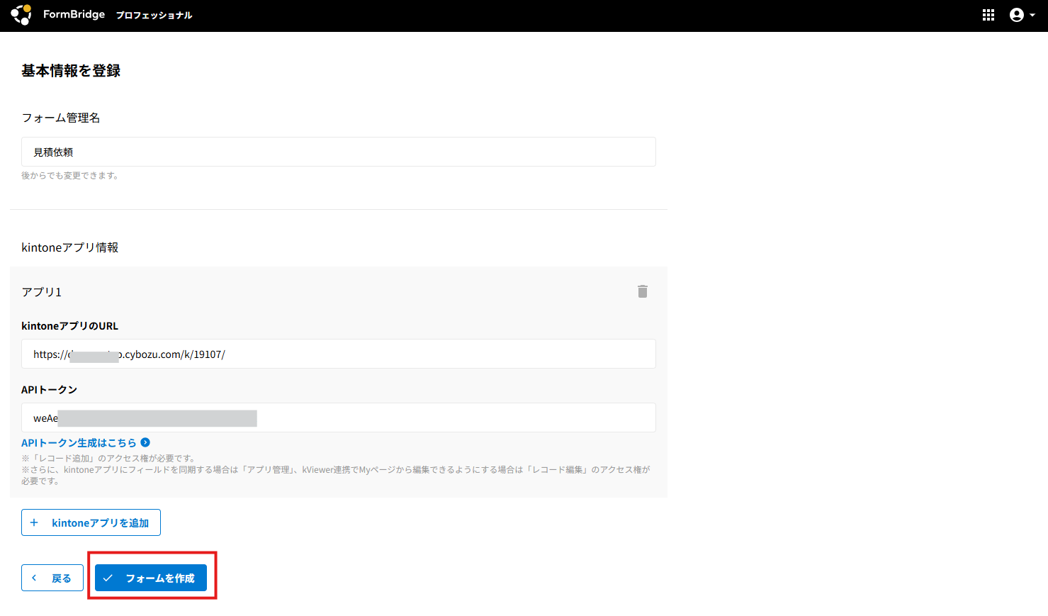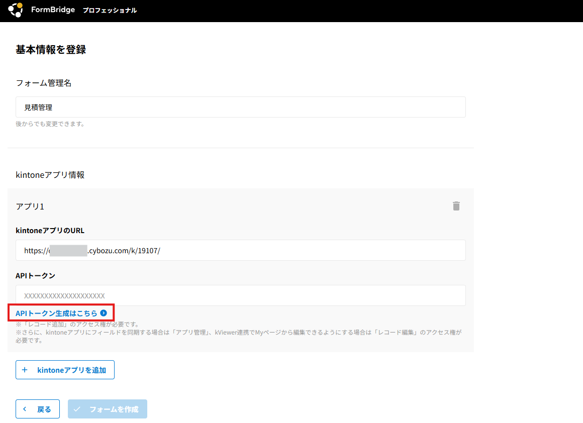 フォームの管理名は、FormBridgeの管理画面のフォーム一覧に表示される名称です。公開フォームに表示されることはありませんので、管理しやすい名称を設定してください。7.APIトークンには「レコード追加」のアクセス権が必要です。