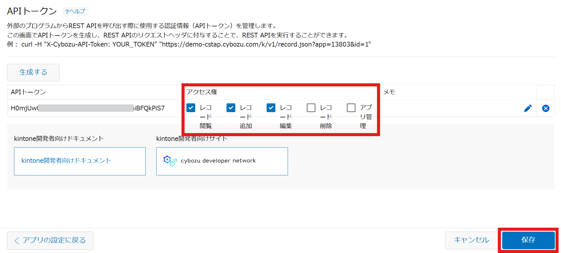 アクセス権の設定後、APIトークンをコピーして、[保存]→[アプリを更新]まで行います。
