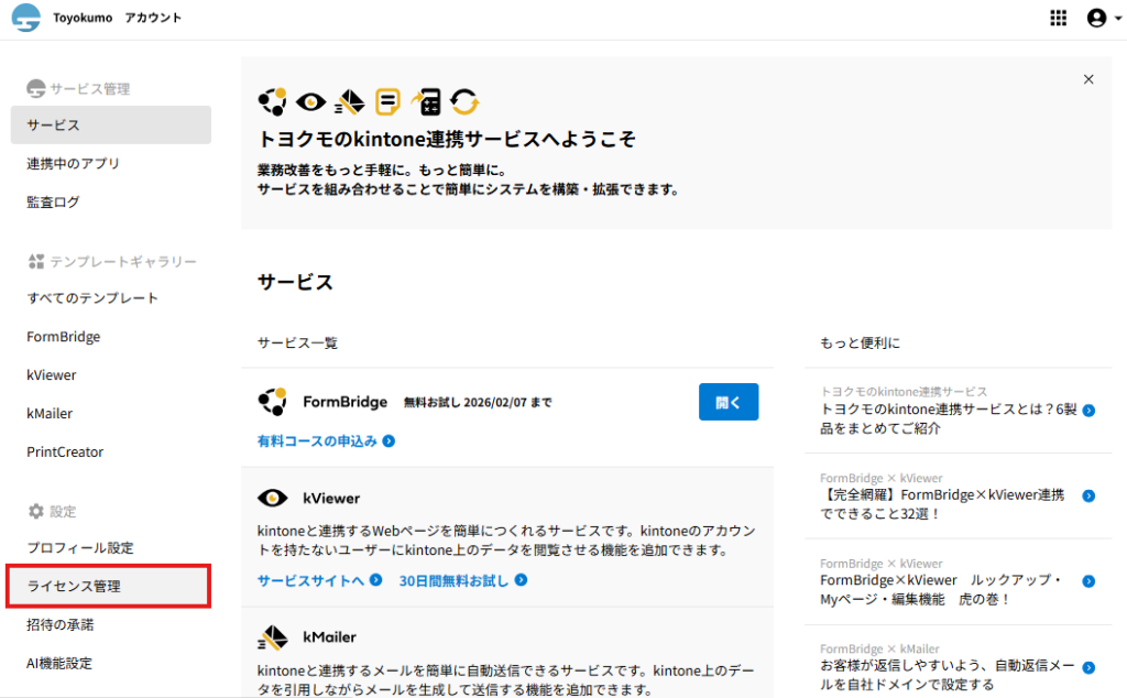 招待された側のユーザーの操作に関してはトヨクモkintone連携サービスの詳細を受け取った際の操作方法をご確認ください。