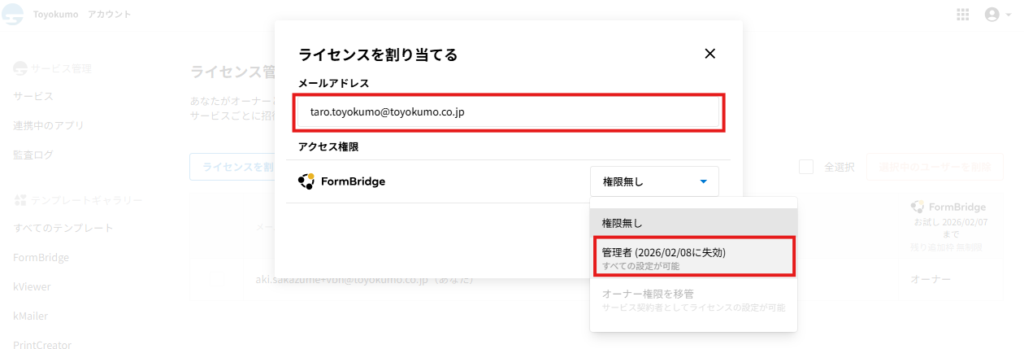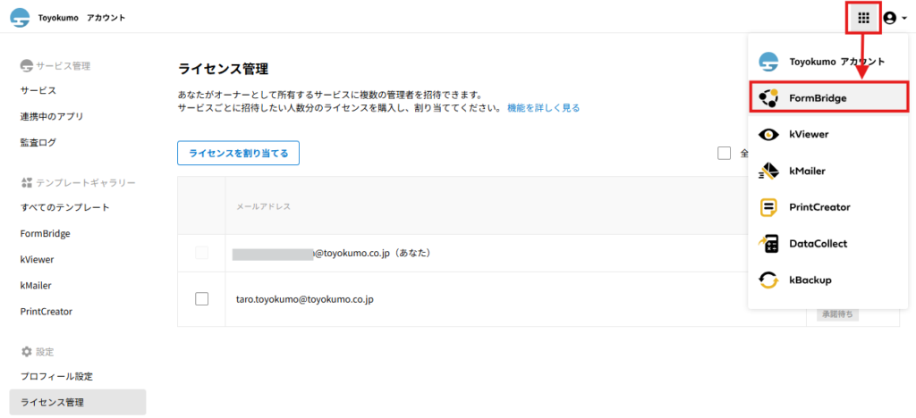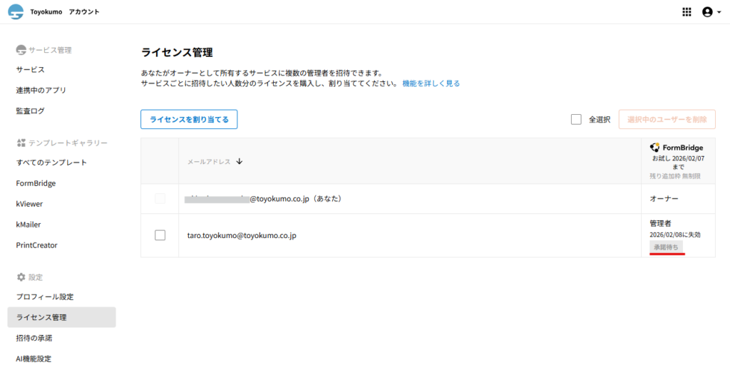FormBridge以外の製品もあわせて複数名で設定する場合、kViewerやPrintCreatorなど、他の製品でも「管理者(XXXX/XX/XXに失効)」を選択し、一度の操作でユーザーライセンスを割り当てることが可能です。20.画面が切り替わり、「承諾待ち」と表示されます。