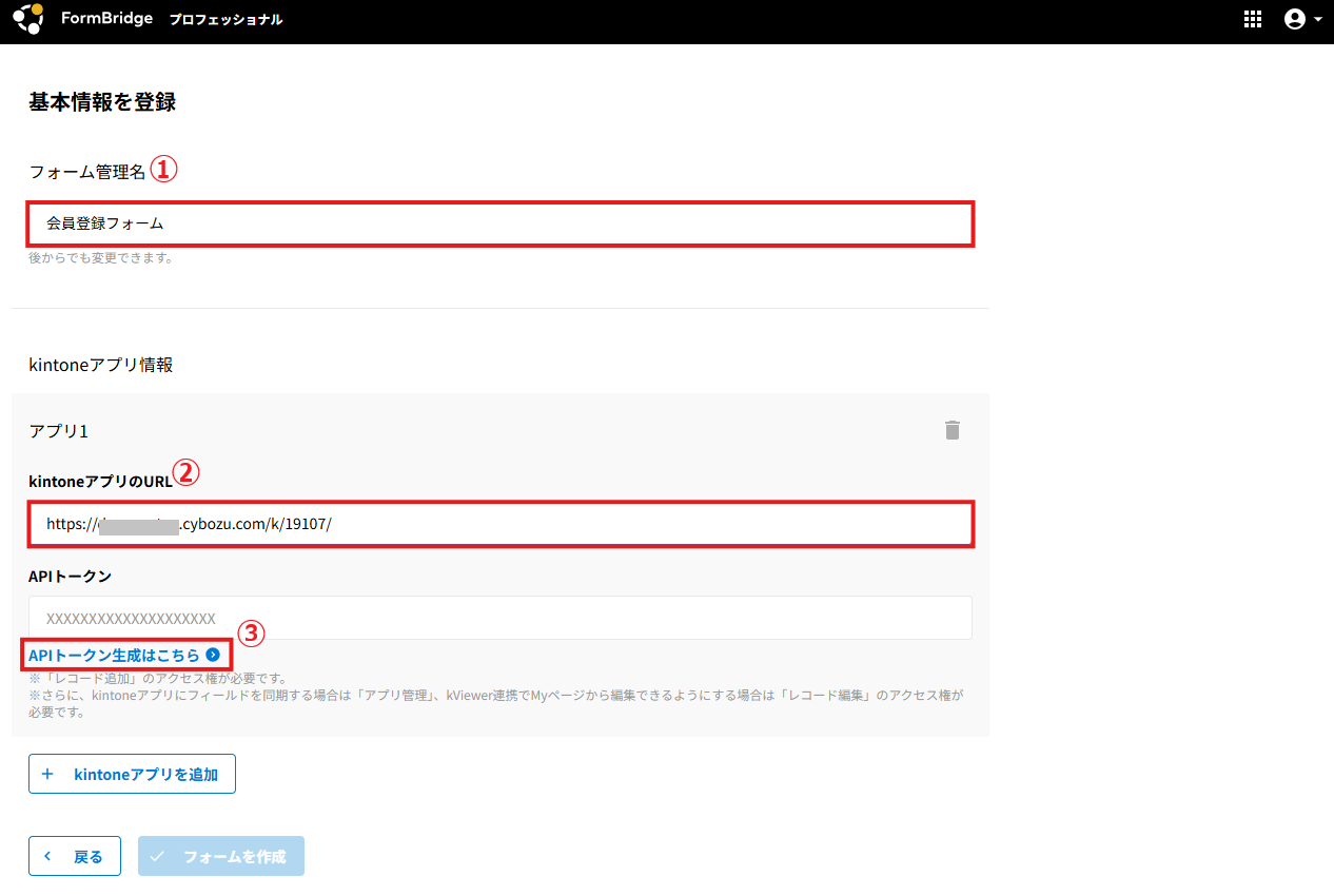 3.FormBridgeと接続を行うkintoneのURLを指定します。
