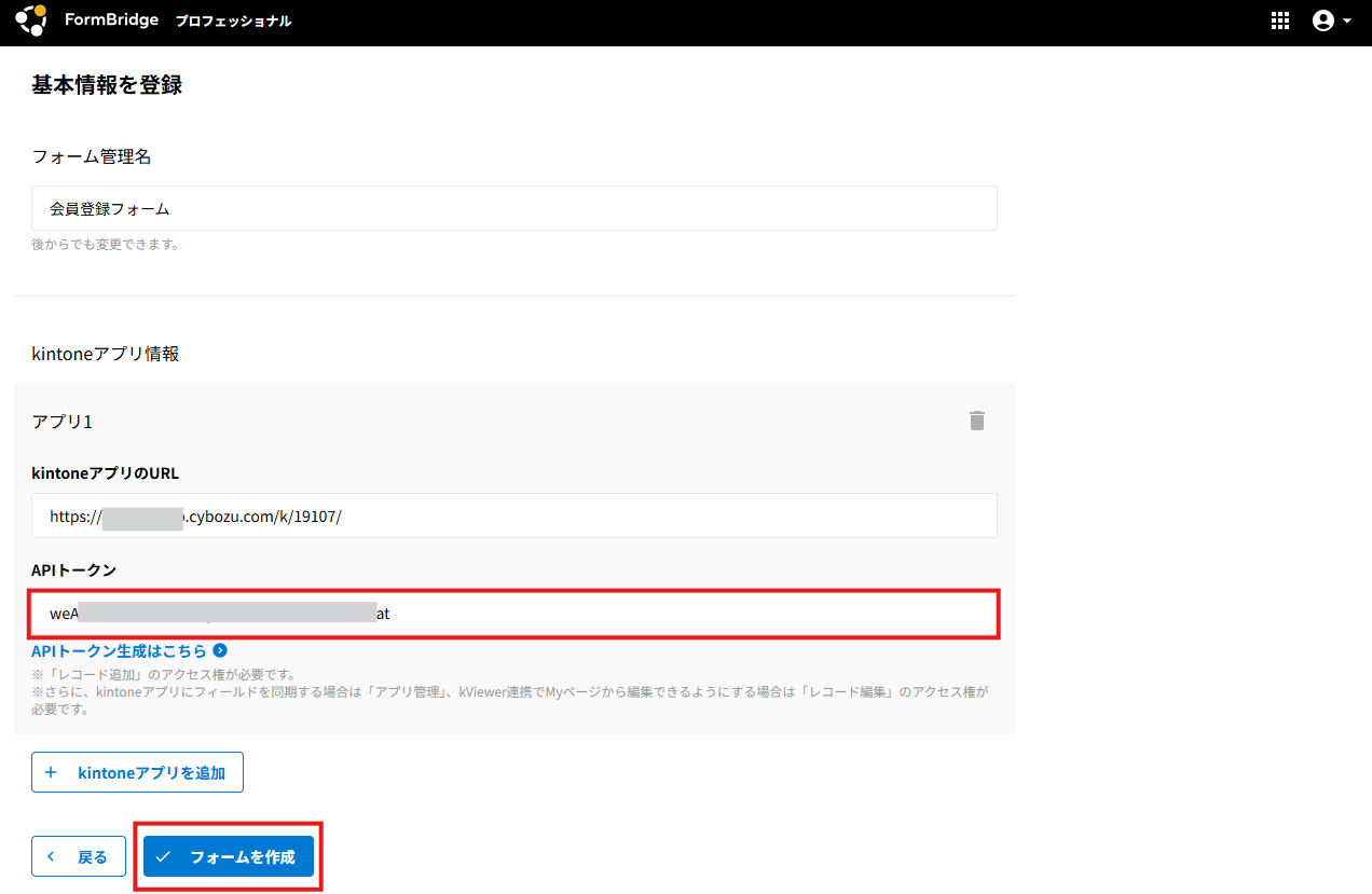 9.FormBridgeの画面に戻り、コピーしたAPIトークンをペーストします。