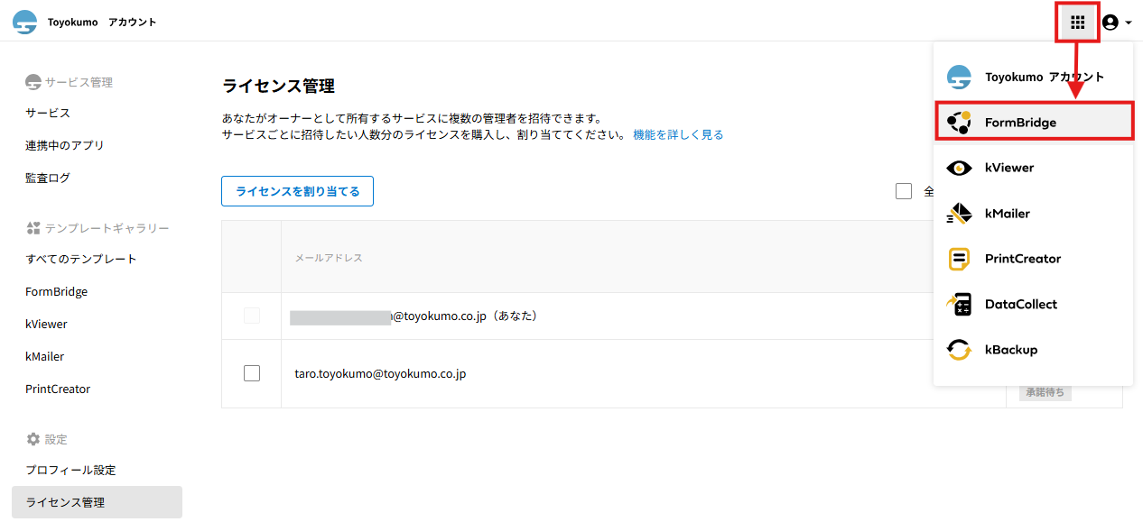 FormBridge以外の製品もあわせて複数名で設定する場合、kViewerやPrintCreatorなど、他の製品でも「管理者(XXXX/XX/XXに失効)」を選択し、一度の操作でユーザーライセンスを割り当てることが可能です。20.画面が切り替わり、「承諾待ち」と表示されます。