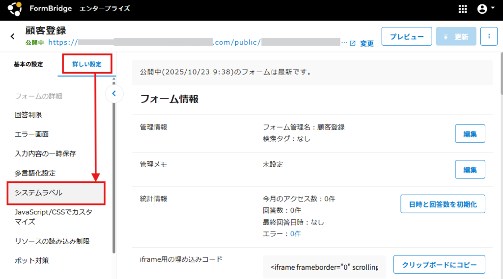 回答ボタンやエラーメッセージなど、フォームやエラー画面等に表示されるシステムラベルの文言を変更できます。