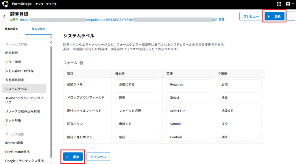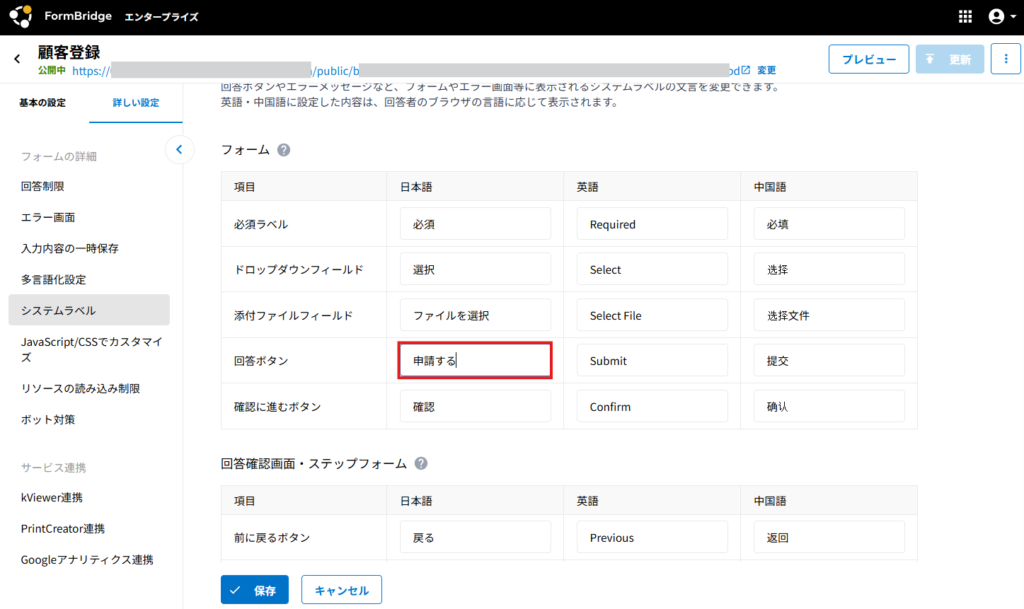 - システムラベルでは、FormBridge側で事前に用意している「回答」「確認」などのボタンやエラーメッセージなどのシステム上の文言を変更します。