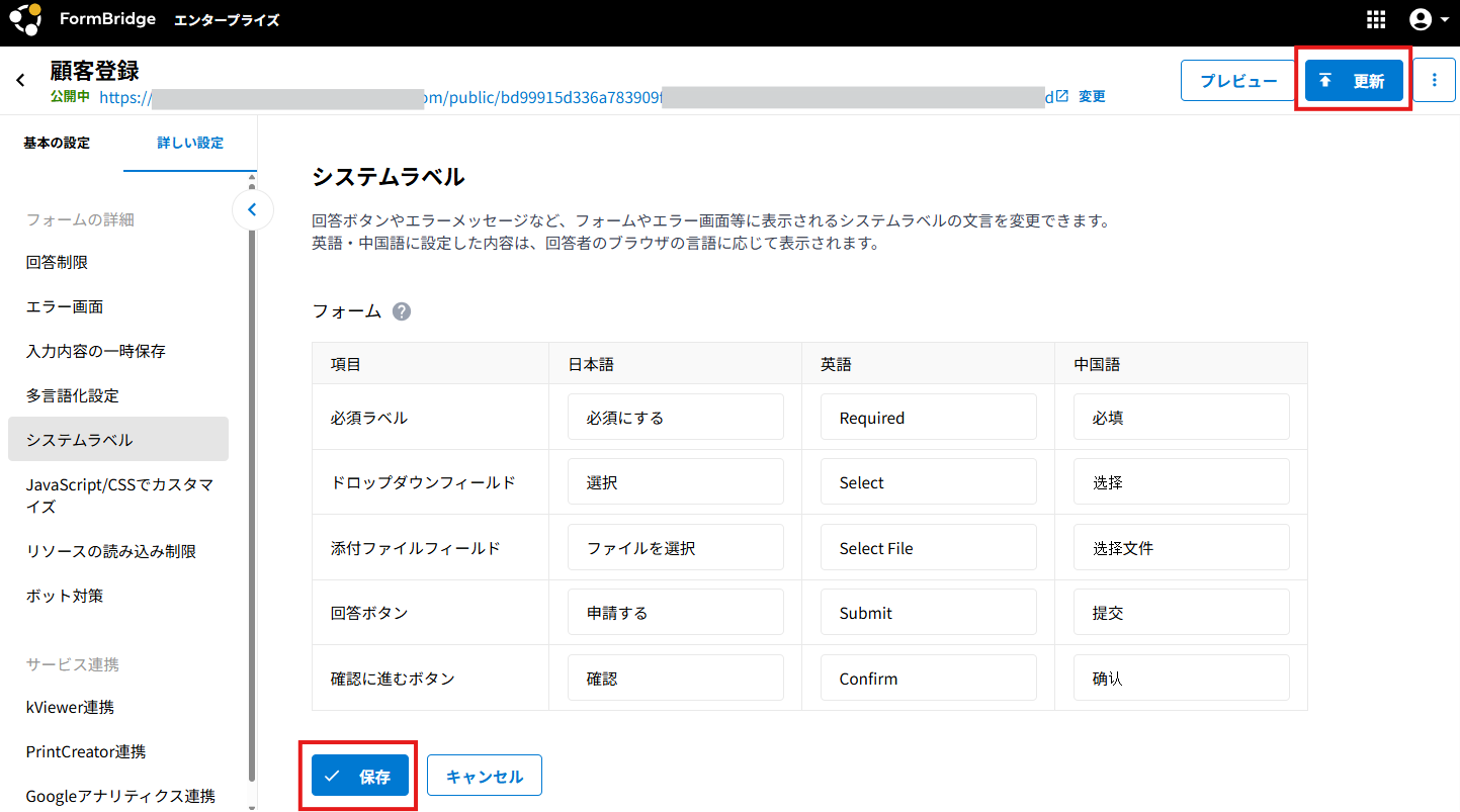 「英語」「中国語」のシステムラベル設定を確認される場合、FormBridgeの管理画面にアクセスしているブラウザでは、言語設定を「英語」、「中国語」にしていても、FormBridgeの環境の言語が優先されるため、日本語で表示されます。一度ログアウトされるか、別ブラウザ、またはブラウザのシークレットモードで反映を確認してください。