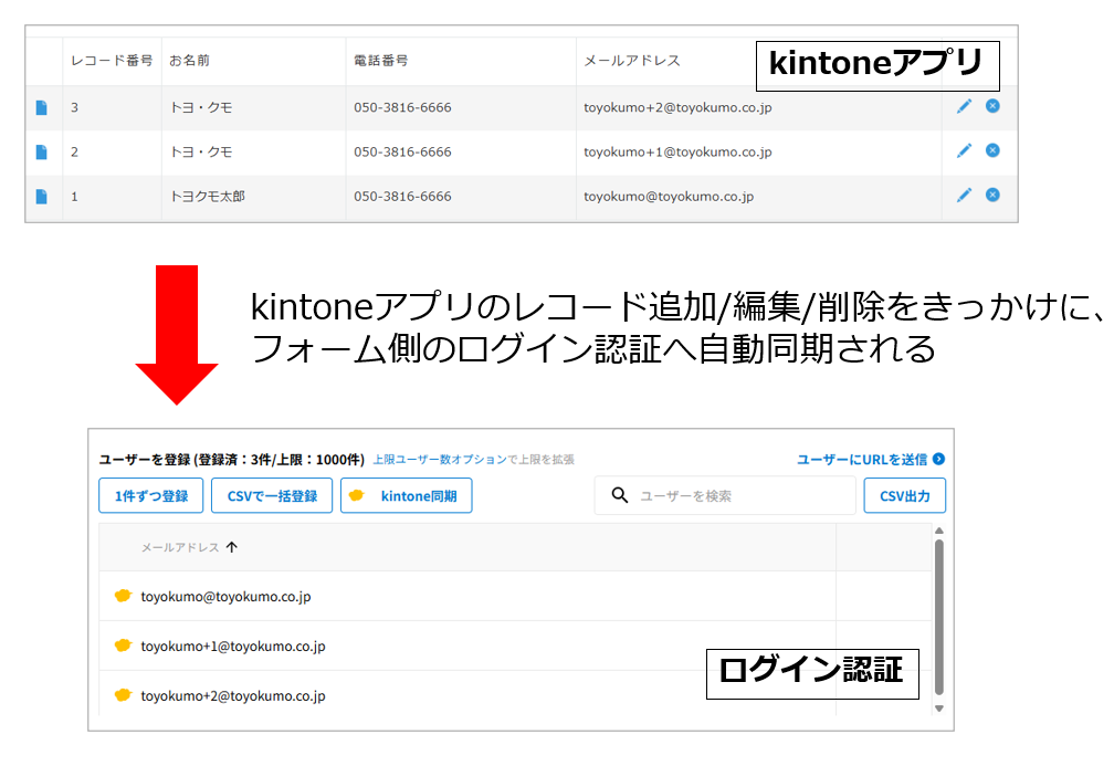 kintoneのWebhookの機能により、kintoneアプリへの「レコードの追加/レコードの編集/レコードの削除」をきっかけに、ログイン認証で利用するユーザー情報を自動で同期することができます。