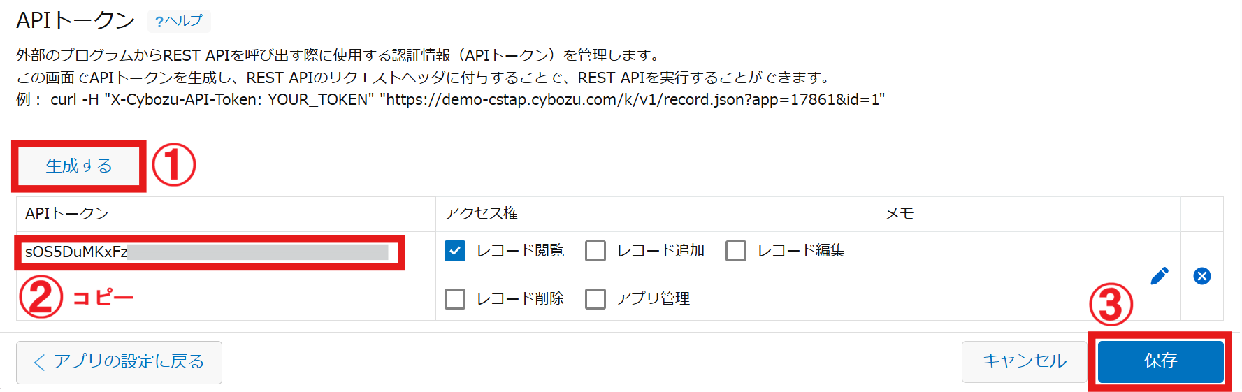 他の権限については、必要に応じて付与してください。アクセス権の設定後、APIトークンをコピーして、[保存]→[アプリを更新]まで行います。