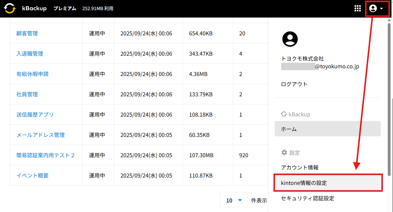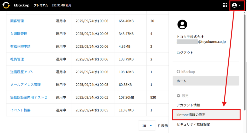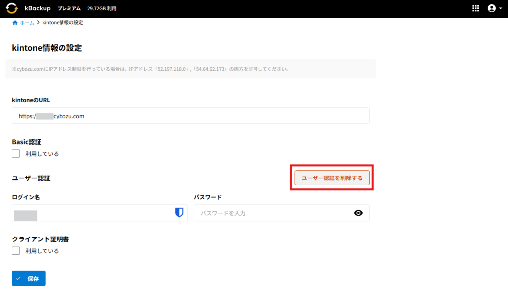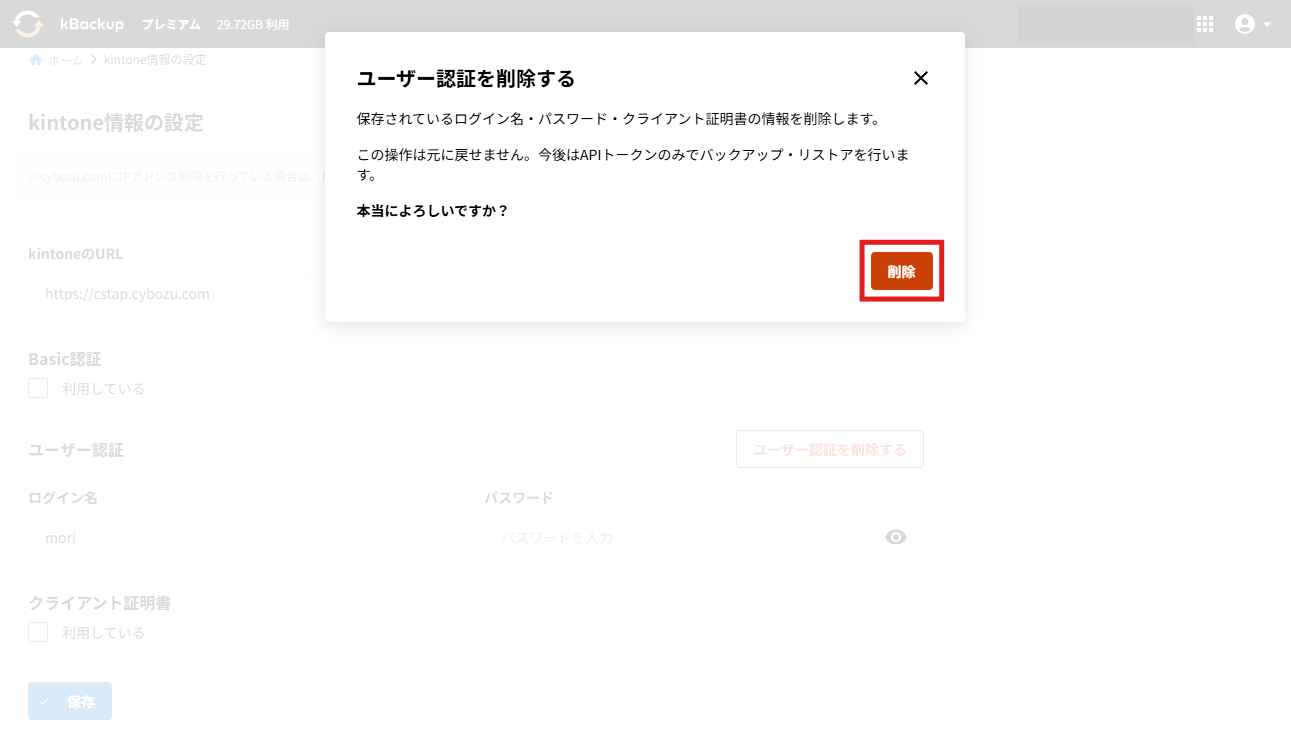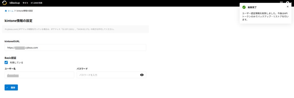 ホームkBackup kBackupに登録したkintoneのユーザー認証情報を削除する 2024年10月22日2025年9月24日 SHARE ツイート シェア はてブ LINE Pocket kBackupに登録されているアプリ全てにAPIトークンを設定されている場合、kBackupに登録したkintoneのユーザー情報を削除することが可能です。 設定方法 1.kBackupにログインし、右上のアイコンをクリックし、メニューから「kintone情報の設定」をクリックして開きます。 2.「ユーザー認証を削除する」をクリックします。 3.アラートを確認し、「削除」をクリックします。 4.「削除完了」と表示が出れば問題なくユーザー認証情報の削除が完了しています。 コメントを残す コメントをキャンセルメールアドレスが公開されることはありません。 ※ が付いている欄は必須項目ですコメント ※ 名前 ※ メール ※ サイト 次回のコメントで使用するためブラウザーに自分の名前、メールアドレス、サイトを保存する。 Captcha * Type the text displayed above: