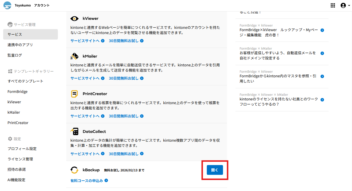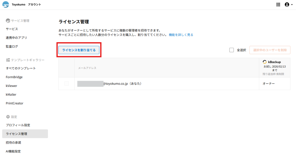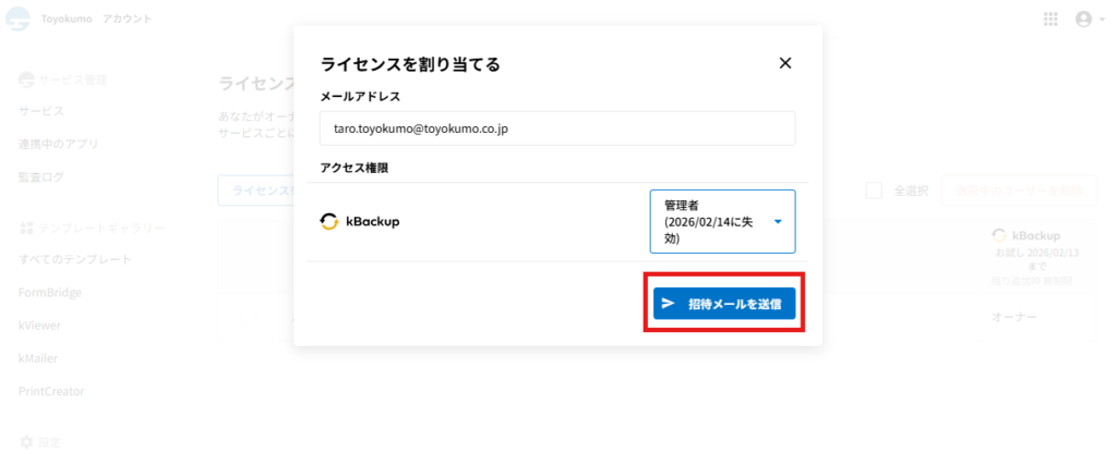招待された側のユーザーの操作に関してはトヨクモkintone連携サービスの詳細を受け取った際の操作方法をご確認ください。