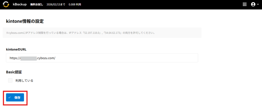- cybozu.comにてIPアドレス制限などのセキュリティ設定を行っている場合、kBackupからアクセスができるように設定する必要があります。