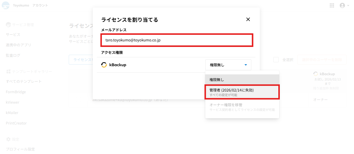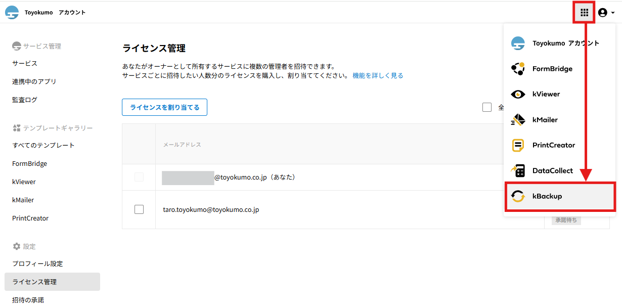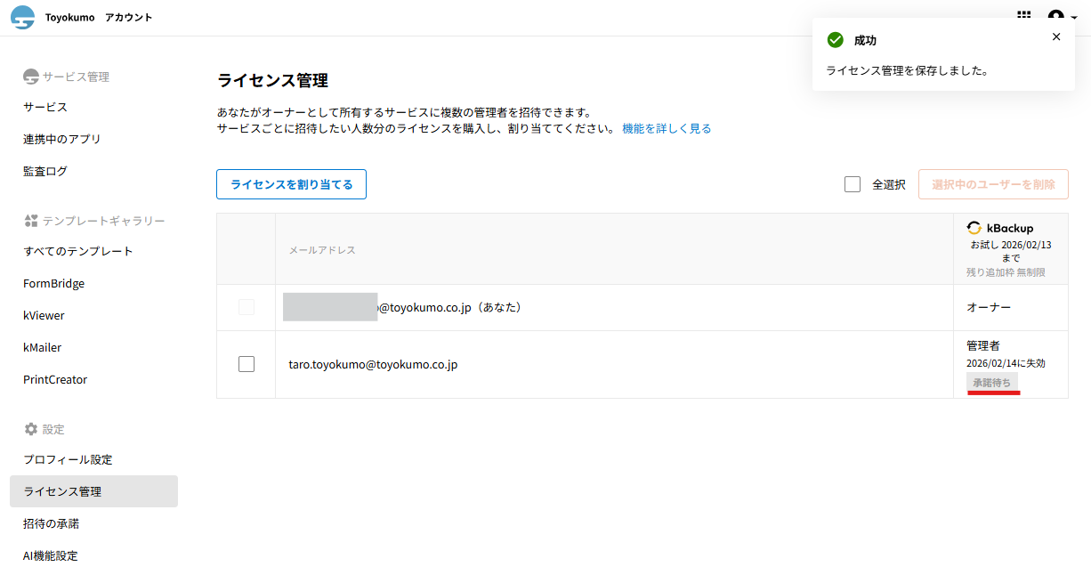 招待された側のユーザーの操作に関してはトヨクモkintone連携サービスの詳細を受け取った際の操作方法をご確認ください。