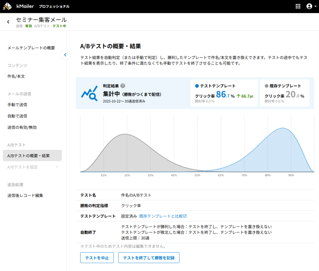 この画面を確認し、「テストを終了して勝敗を記録」より手動でA/Bテストを終了させることも可能です。
