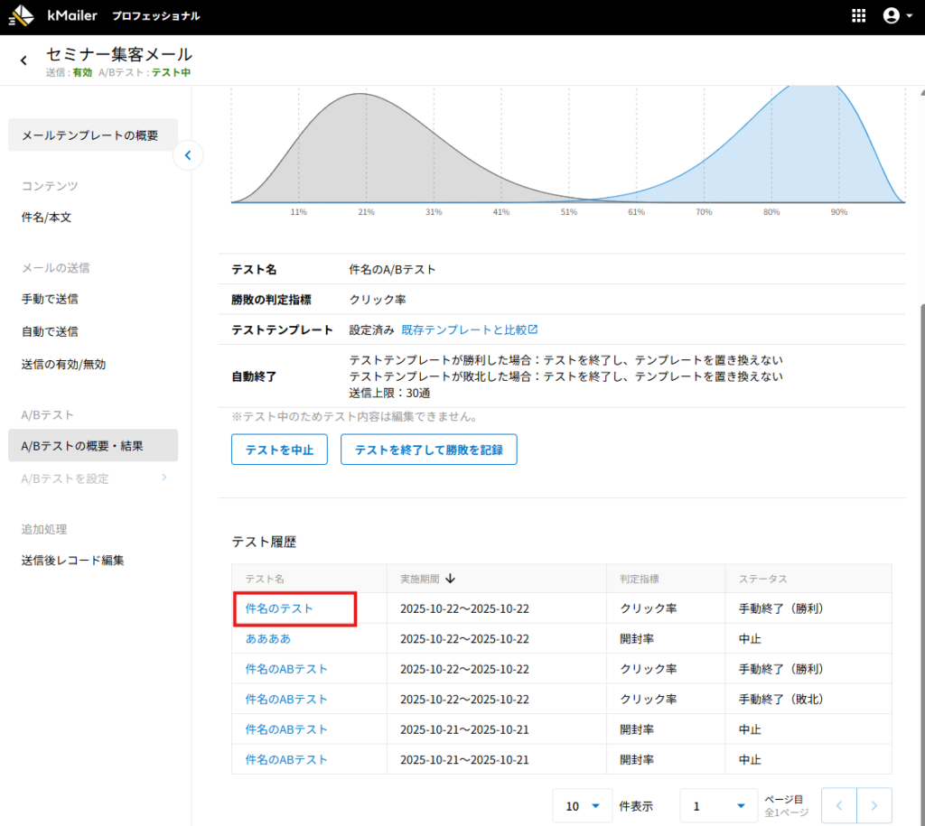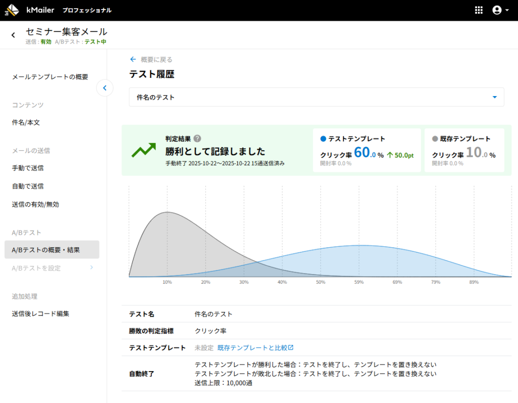 この画面を確認し、「テストを終了して勝敗を記録」より手動でA/Bテストを終了させることも可能です。