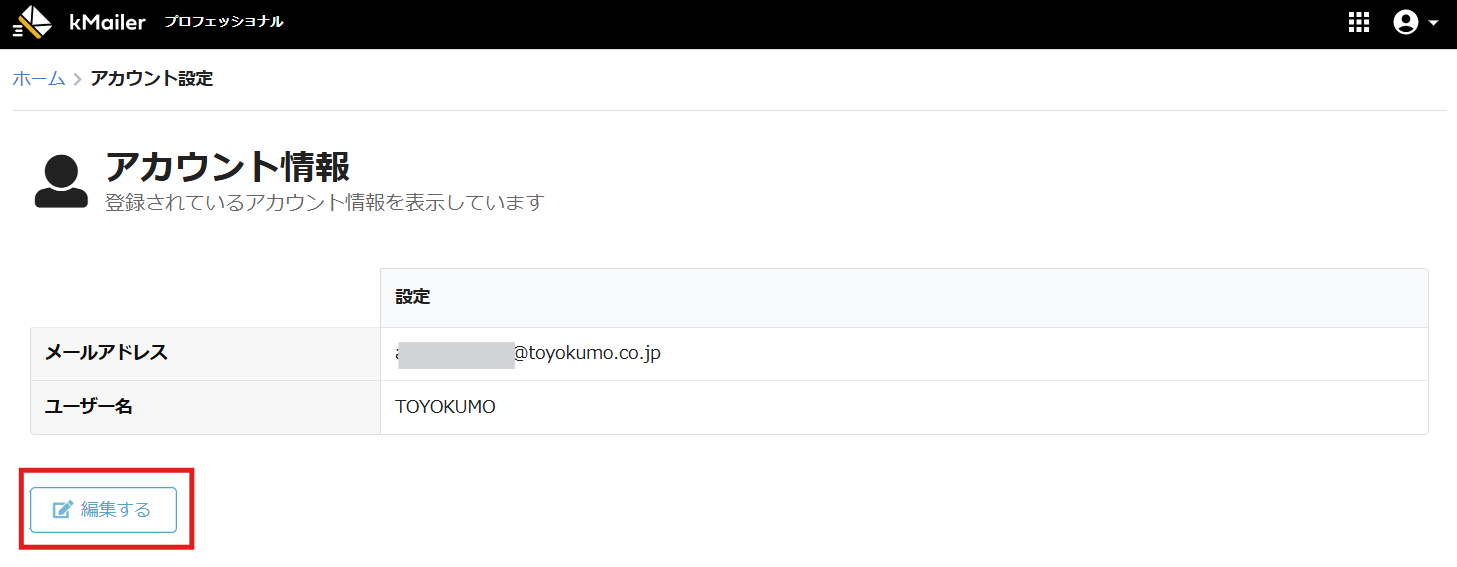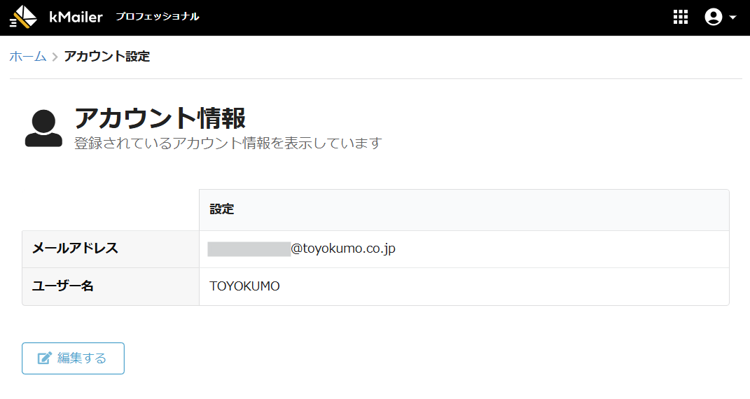1.kMailerにログインしている状態で、画面右上のアイコンより、「設定」>「アカウント情報」を選択します。
