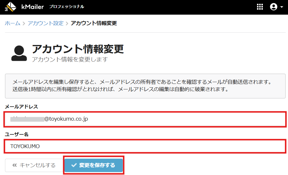 kMailerにログインするための「メールアドレス」や「ユーザー名」を変更する設定です。