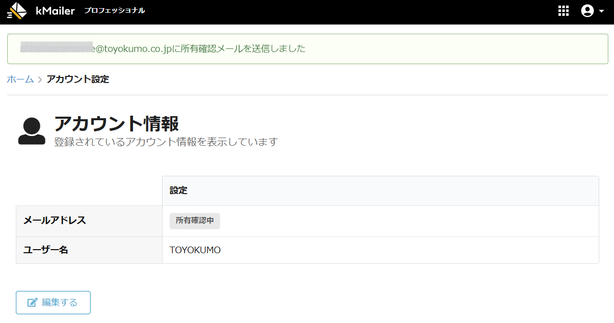 4.メールアドレスを変更した場合、メールアドレスが「所有確認中」という表示になります。