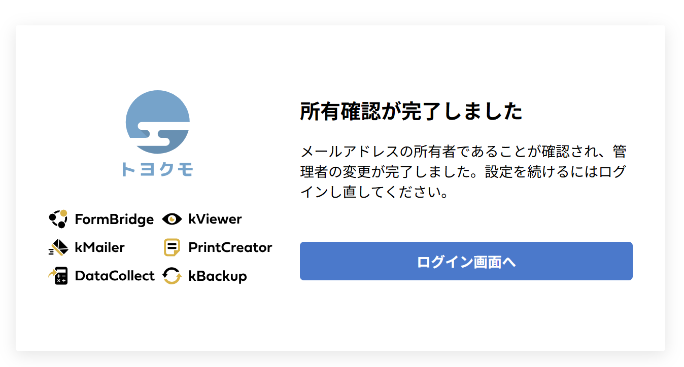 6.「所有確認が完了しました」という画面が表示され、管理者メールアドレスの変更が完了しました。続けて設定を行う場合は[ログイン画面へ]をクリックしログインし直す必要があります。