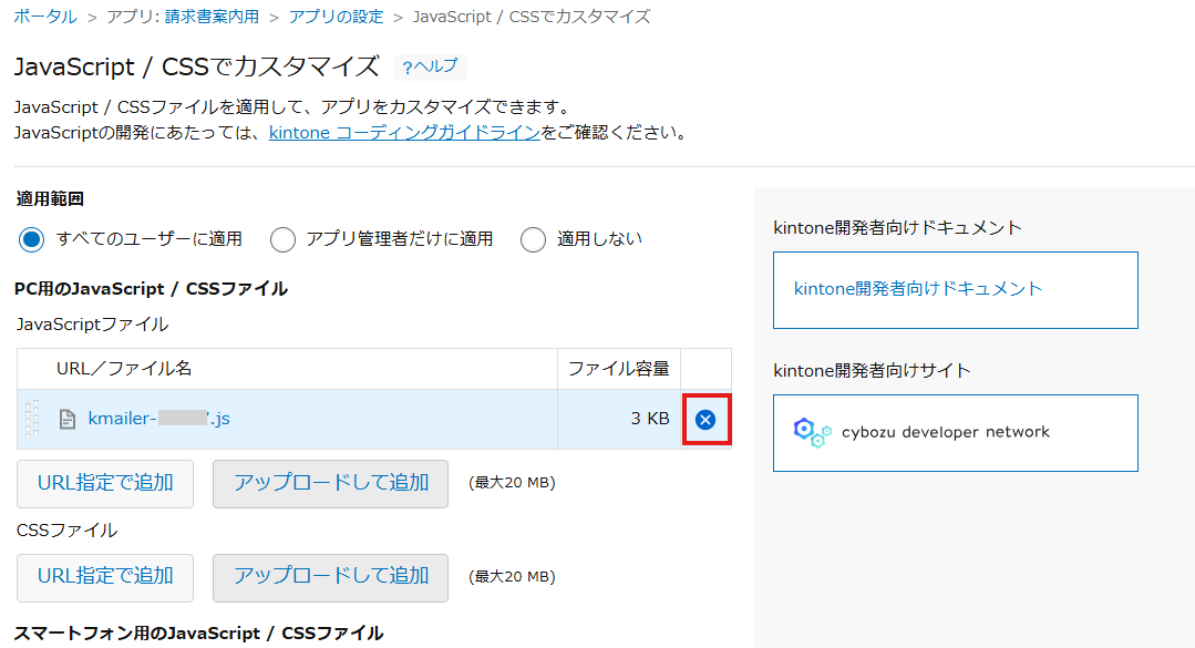 kintoneアプリにすでにkMailerのJavaScriptが設定されている場合、削除していただき、手順3.でダウンロードしたJavaScriptを追加してください。
