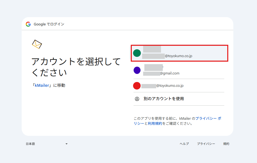 候補が表示されない場合は、「別のアカウントを使用」からメールアドレスとパスワードを入力してください。