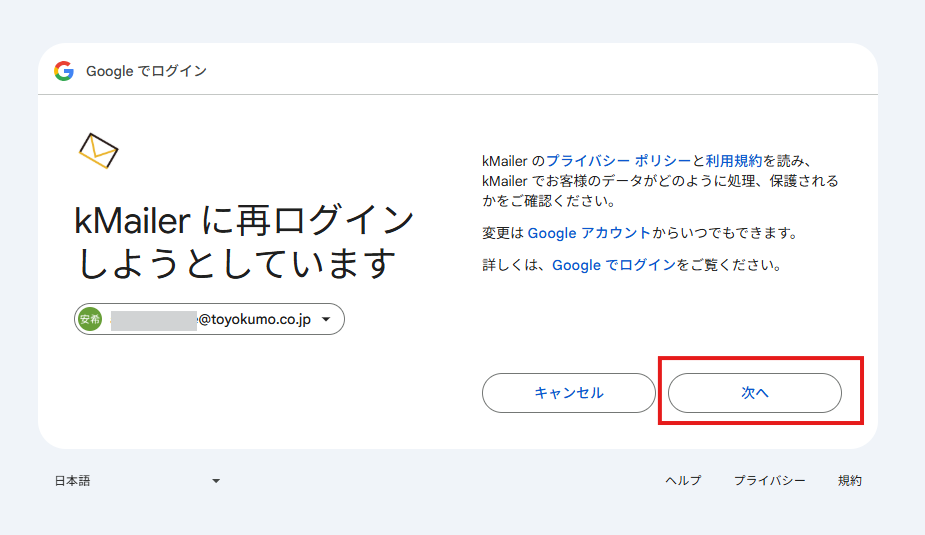 3ー1ー3.「再ログインしようとしています」のような文言が表示される場合は[次へ]をクリックします。