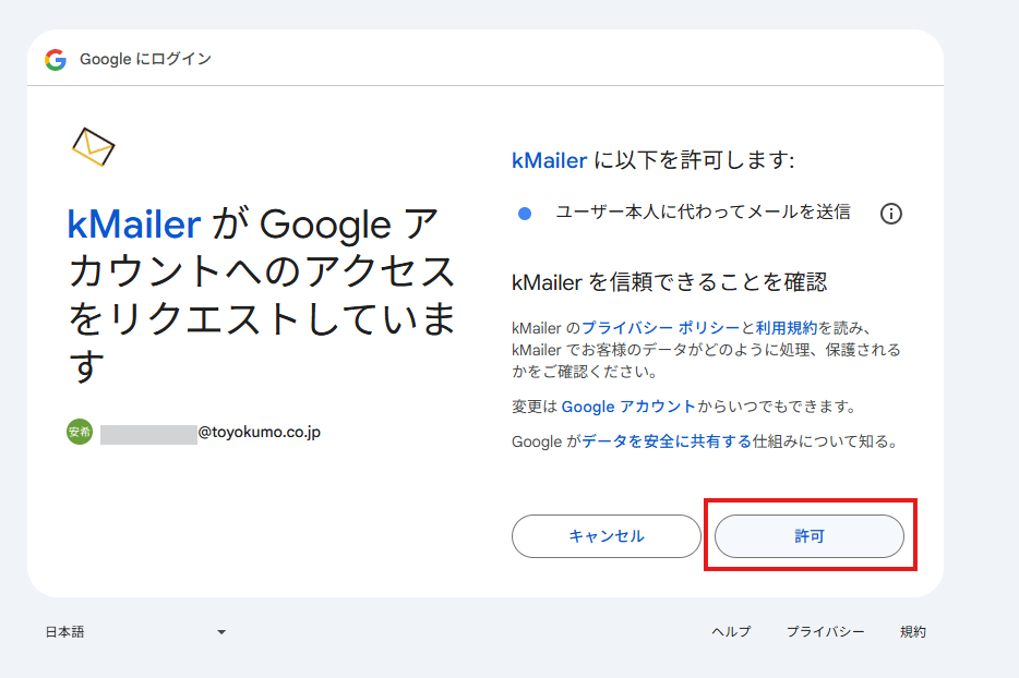 許可が必要な項目について詳細に確認されたい場合は、GoogleアカウントとのOAuth連携時にアクセス許可が必要な項目を教えてください。をご確認ください。