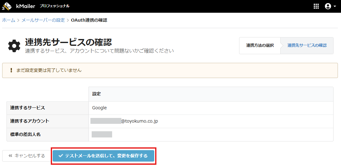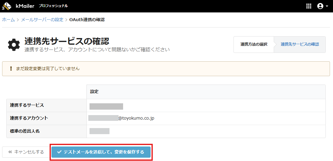 3ー2ー5.[テストメールを送信して、変更を保存する]をクリックします。