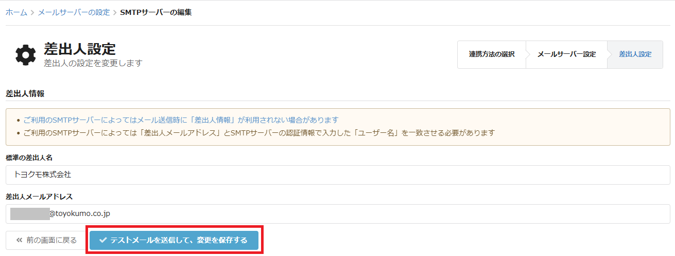 6ー3ー3.差出人設定を行い、[テストメールを送信して変更を保存する]をクリックします。