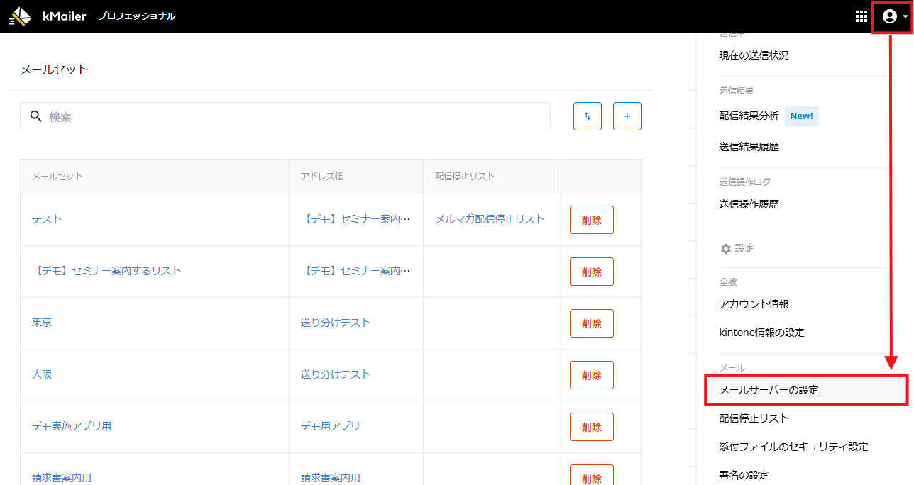 1.kMailerにログインした状態で、右上のアイコンよりメニューを開き、「メールサーバーの設定」をクリックします。