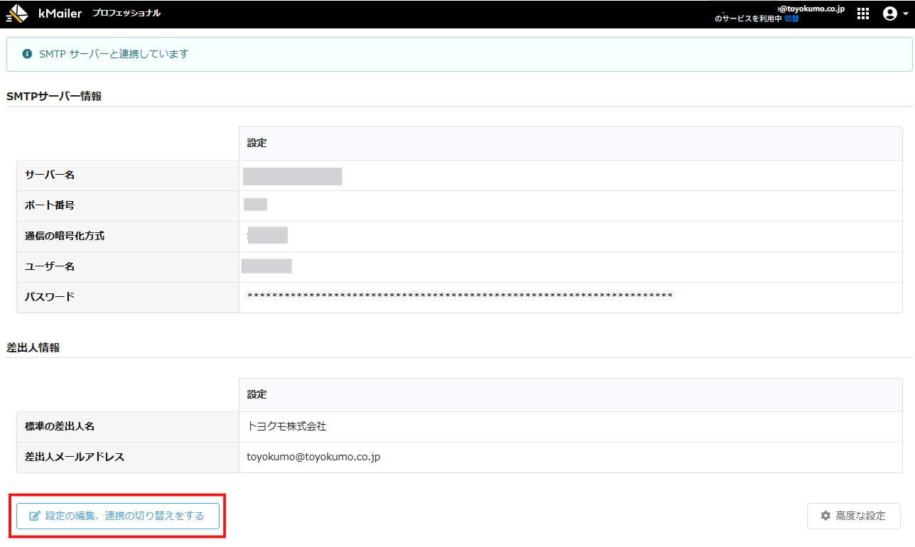 (下段:SMTPサーバー情報を入力して連携している場合)